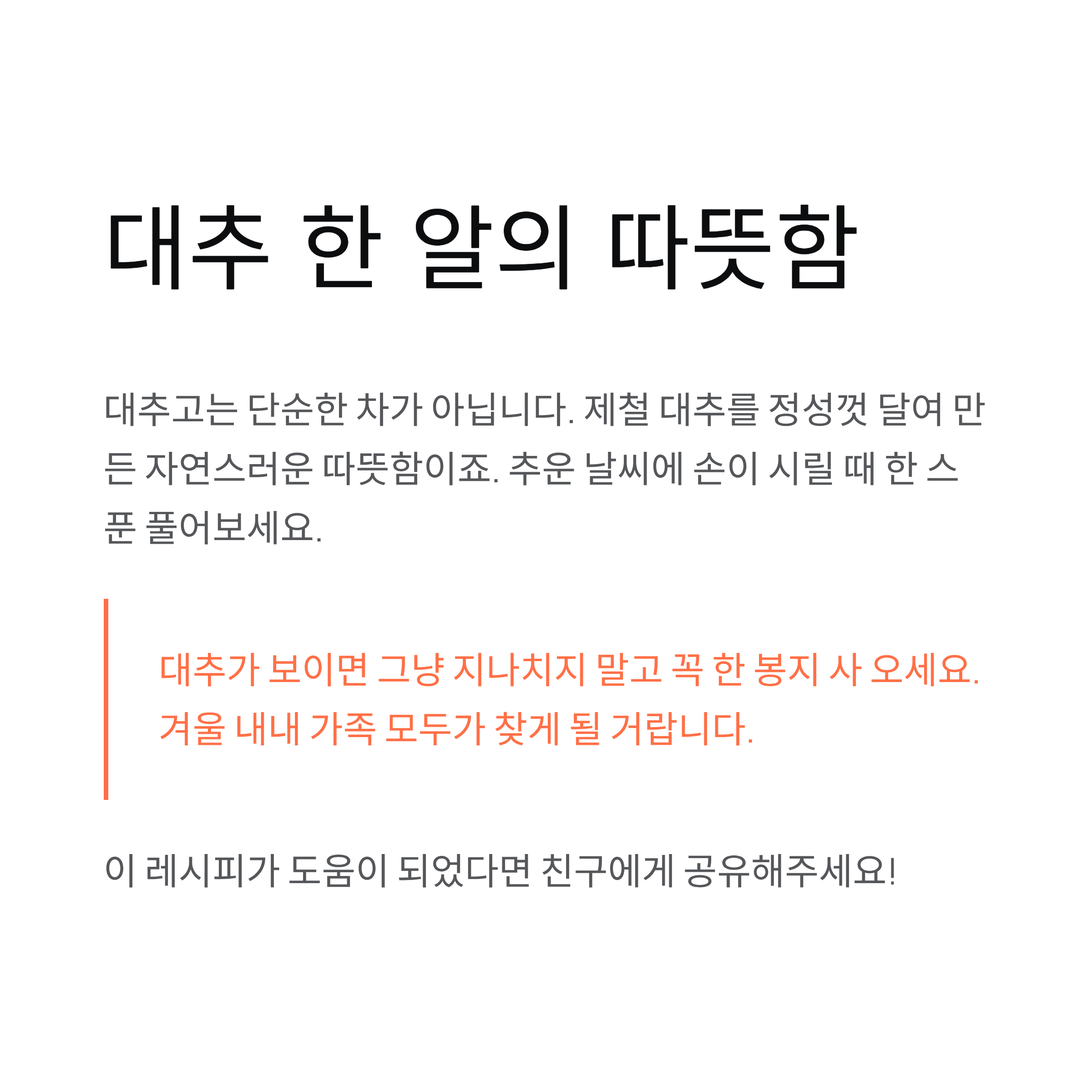 대추고는 단순히 달콤한 차가 아닙니다. 제철 대추를 정성껏 달여 만든 한 병의 자연스러운 따뜻함이죠. 추운 날씨에 손이 시릴 때, 대추고 한 스푼을 따뜻한 물에 풀어보세요. 부드럽게 퍼지는 대추 향이 마음까지 녹여줄 거예요. 이제 대추가 보이면 그냥 지나치지 말고 꼭 한 봉지 사 오세요. 한 번 만들어두면 겨울 내내 가족 모두가 찾게 될 거랍니다.