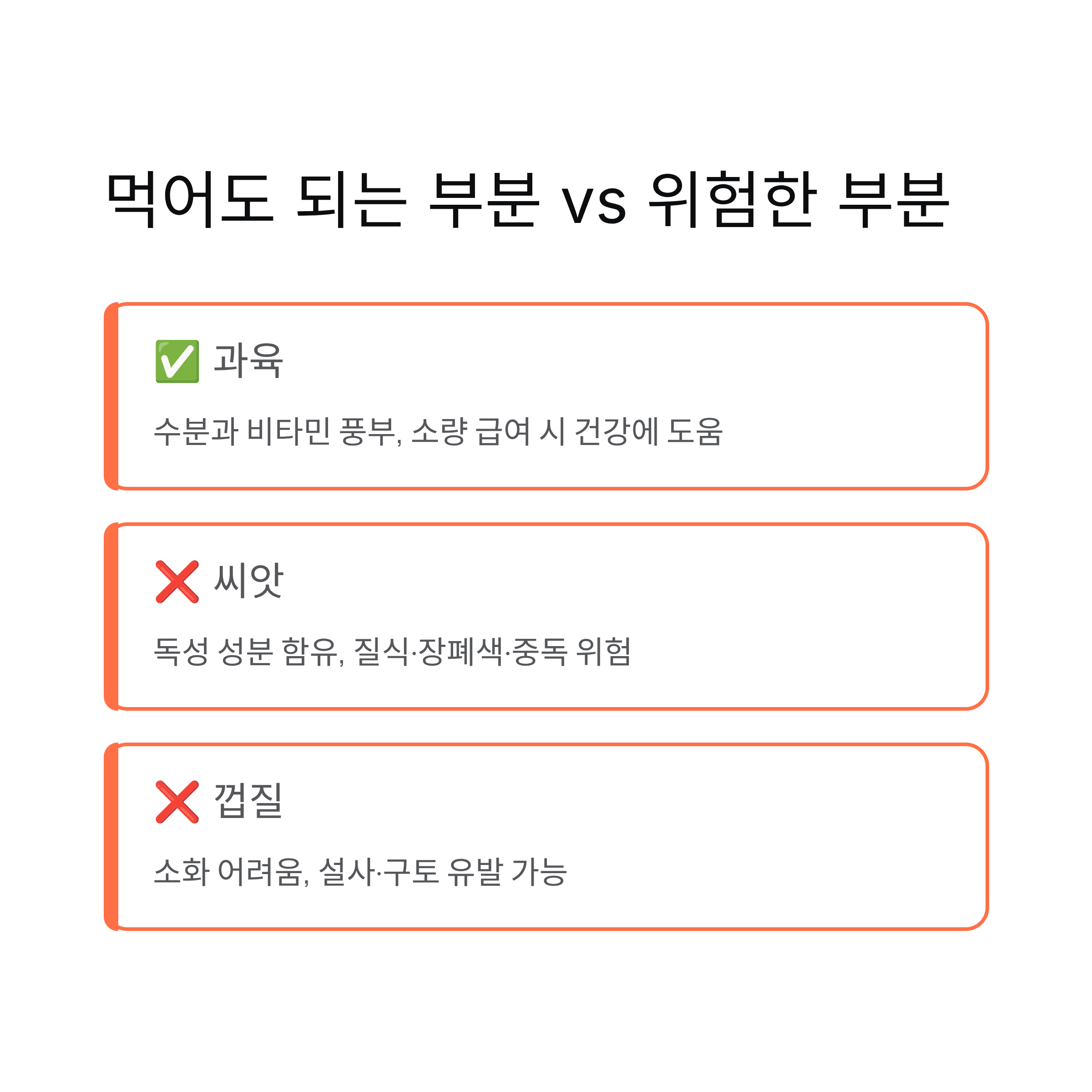하지만 무심코 급여했다가는 소화 장애나 씨앗 사고로 이어질 수 있기 때문에 반드시 올바른 방법으로 줘야 합니다.