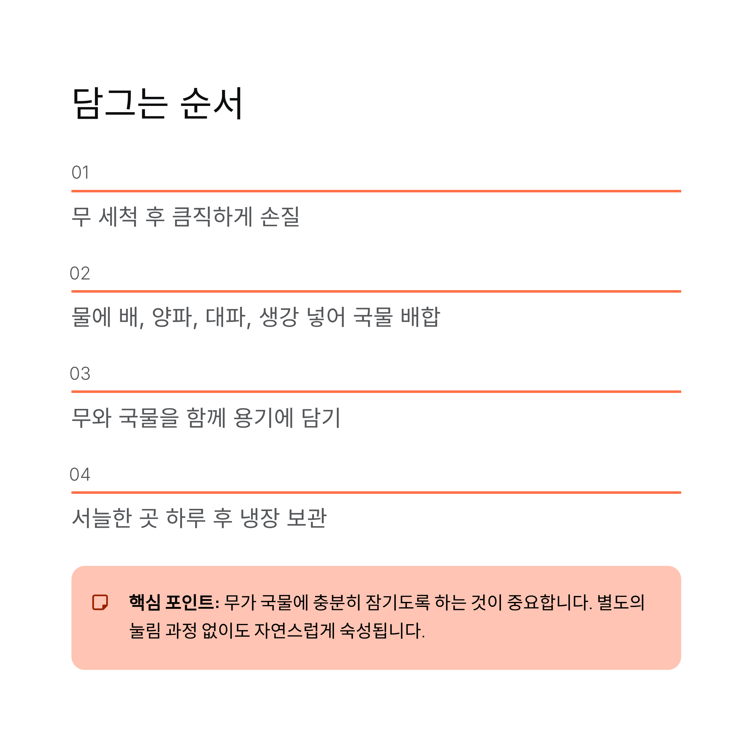 많은 분들이 무를 반드시 오래 절여야 한다고 생각하지만, 이 방법에서는 긴 절임 과정을 생략합니다. 무 자체의 수분과 국물 배합으로 자연스럽게 간이 맞춰지기 때문에 시간과 수고를 크게 줄일 수 있습니다. 대신 국물 비율을 안정적으로 맞추는 것이 중요합니다.