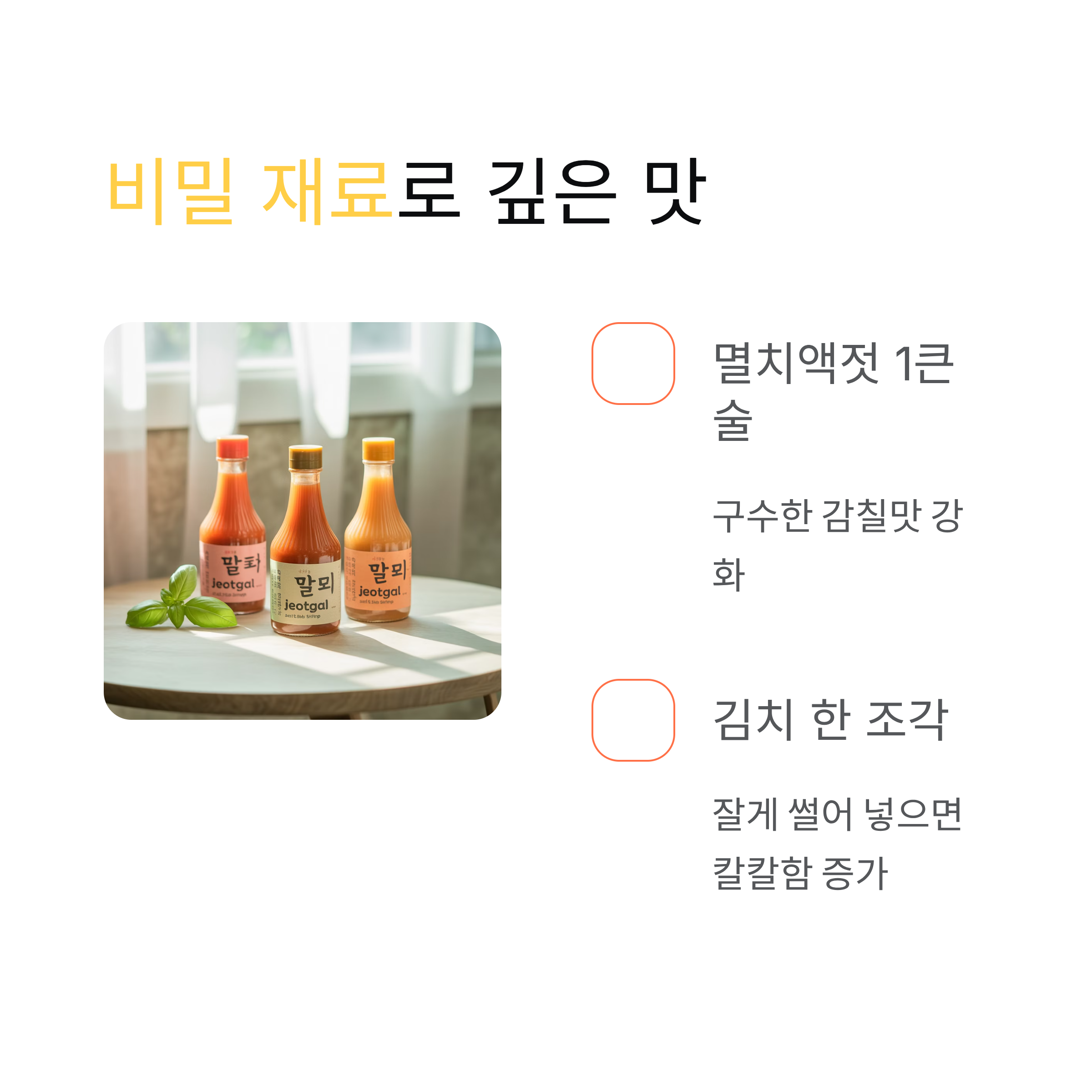 육수 대신 감칠맛을 강화해 줄 비밀 재료는 바로 멸치 액젓이나 새우젓입니다.