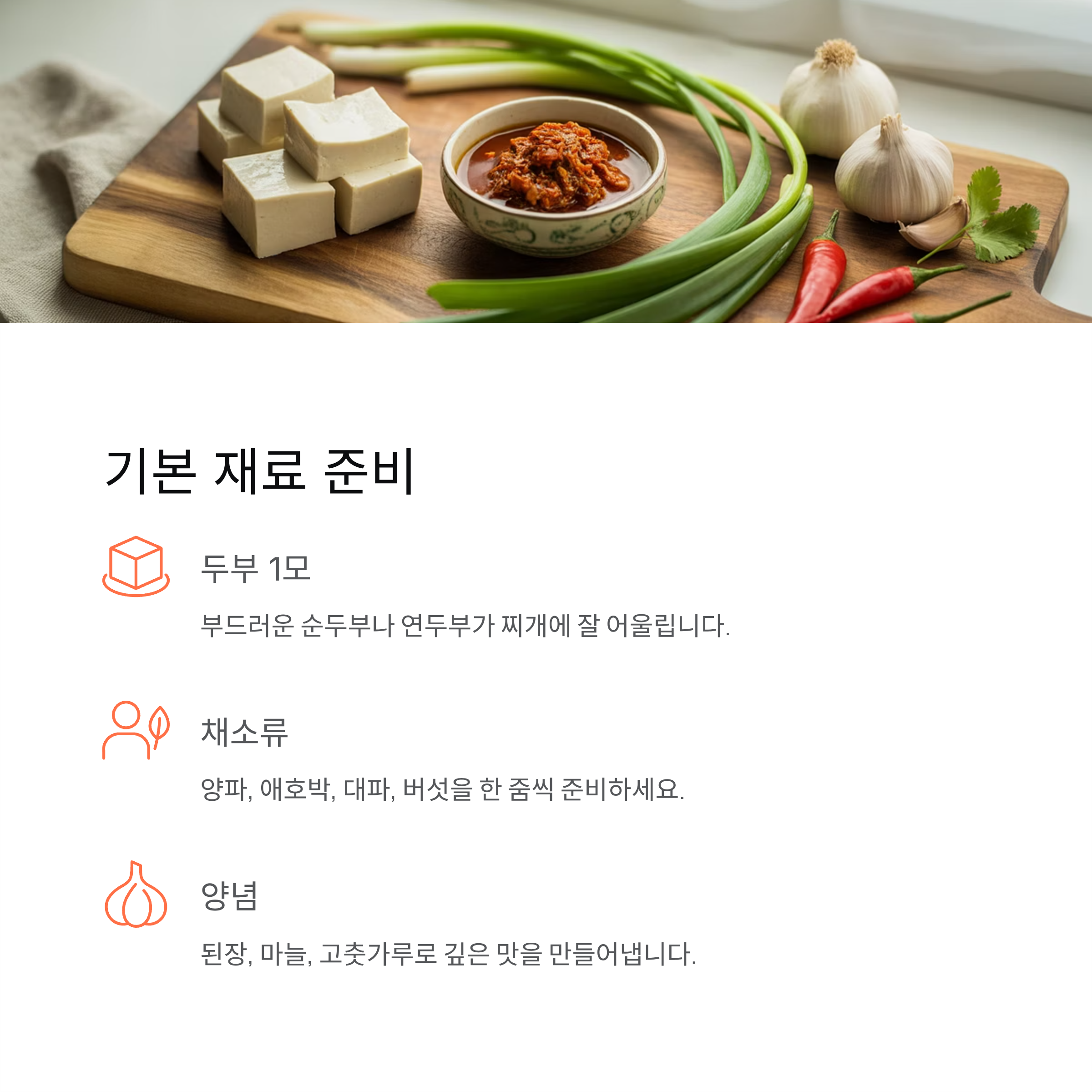 두부, 된장, 마늘, 고춧가루, 양파, 애호박, 대파, 버섯, 다시마 육수 정도만 있으면 기본 찌개가 완성됩니다. 필요에 따라 감자나 고추를 더해도 좋습니다.