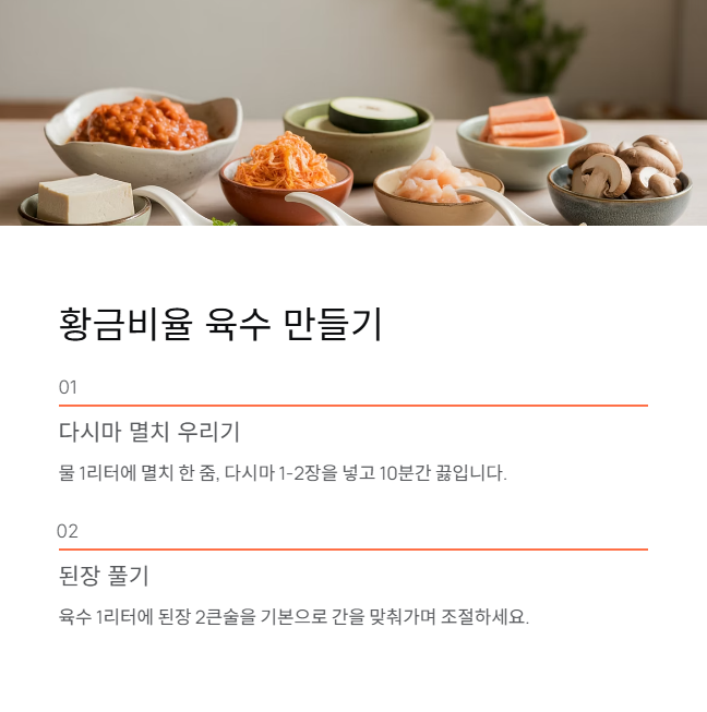 멸치와 다시마를 넣고 약 10분 정도 끓여 육수를 우려냅니다. 물 1리터 기준 멸치 한 줌, 다시마 1~2장을 넣으면 깔끔하면서도 깊은 맛을 낼 수 있습니다.