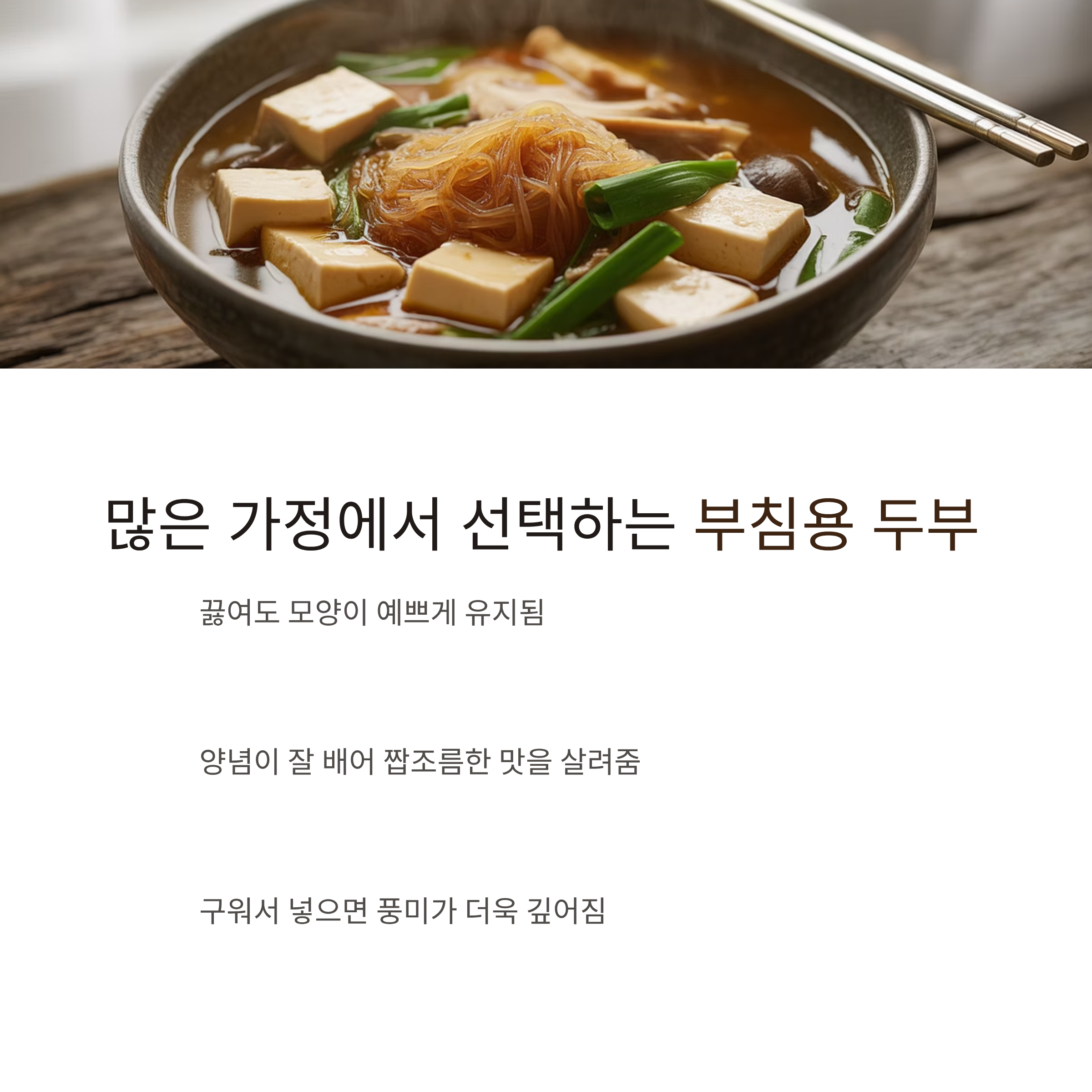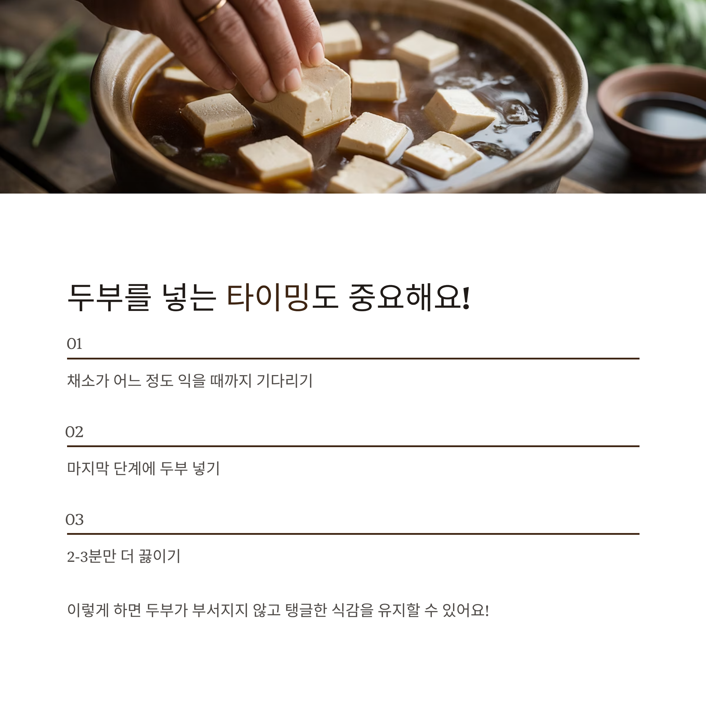 - 그래야 두부가 오래 끓어 부서지지 않고, 탱글한 식감을 유지할 수 있습니다.