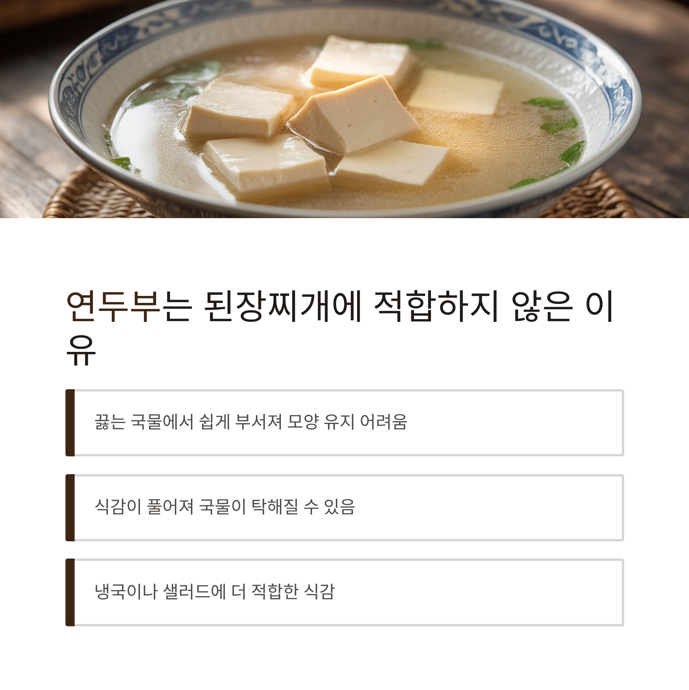 연두부는 부드럽고 고소해서 샐러드나 냉국에 잘 어울립니다. 하지만 된장찌개에는 적합하지 않은 이유가 있어요.