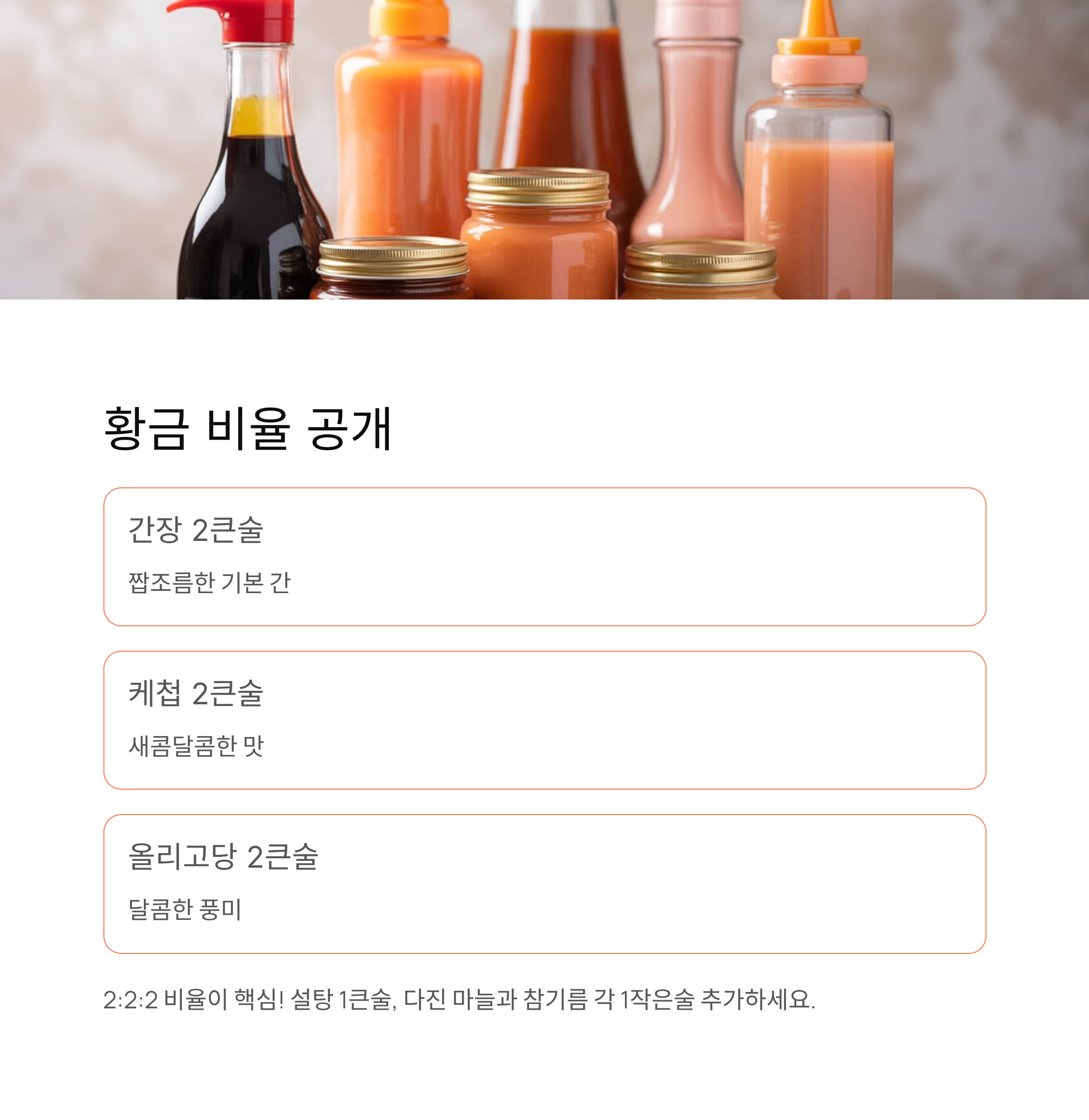 이 비율이 가장 기본적인 달콤 소스의 조합이며, 케첩과 올리고당의 양을 늘리면 더 달콤하게 조절할 수 있습니다.