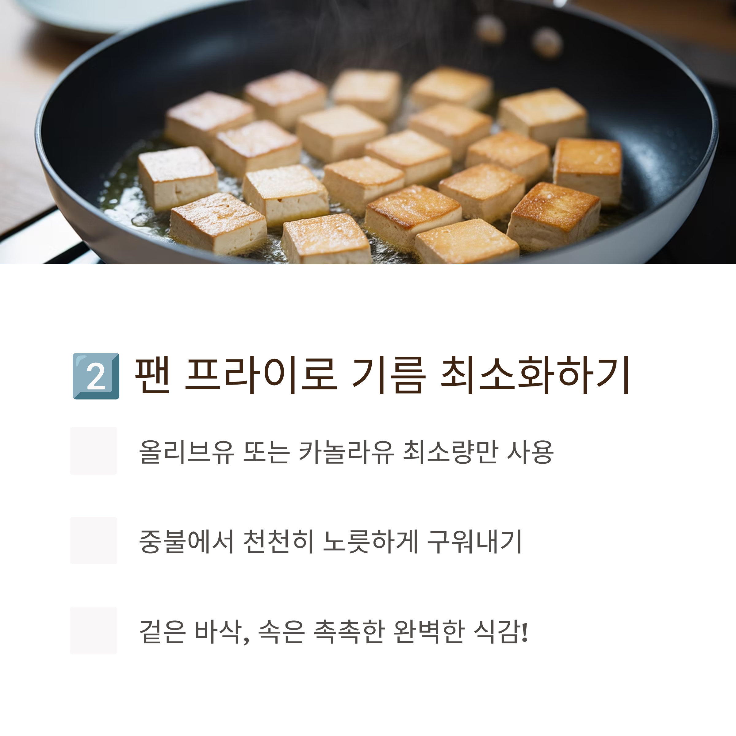 두부강정은 기름에 튀기지 않고 에어프라이어나 최소 기름 팬 프라이로 조리하면 칼로리를 대폭 줄일 수 있습니다.