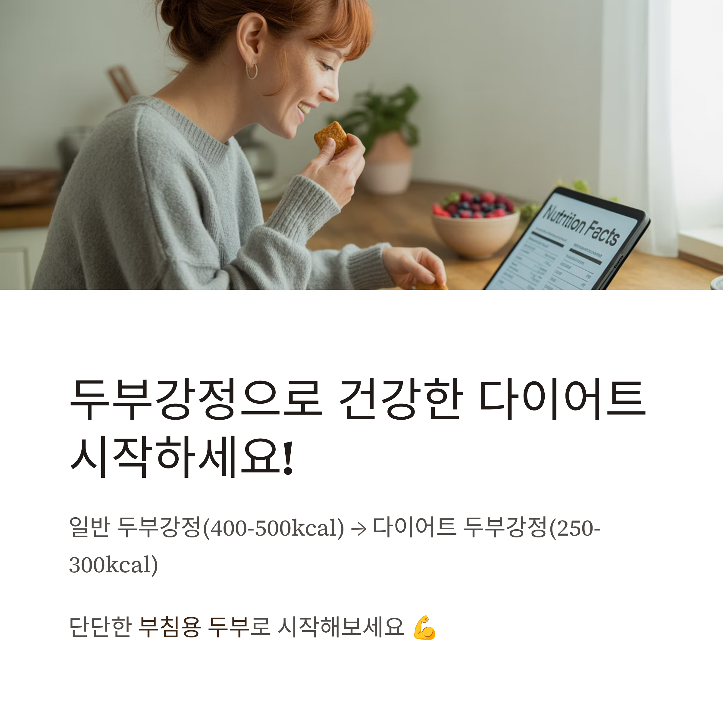 👉 일반 튀김 두부강정은 1인분(200g 기준) 약 400500kcal. 에어프라이어 방식은 250300kcal로 낮출 수 있습니다.