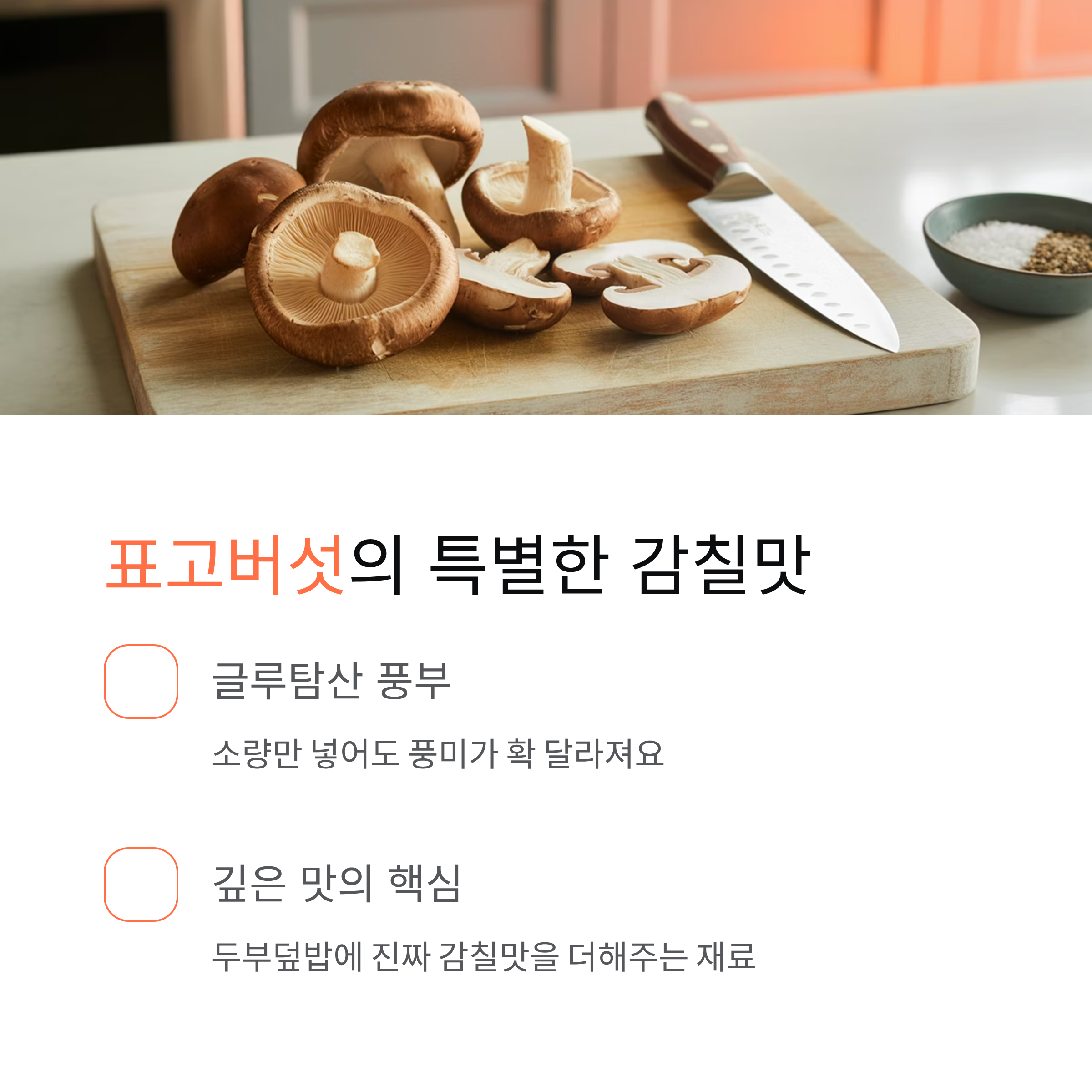 표고버섯은 글루탐산이 풍부해 두부덮밥에 깊은 맛을 더해줍니다.