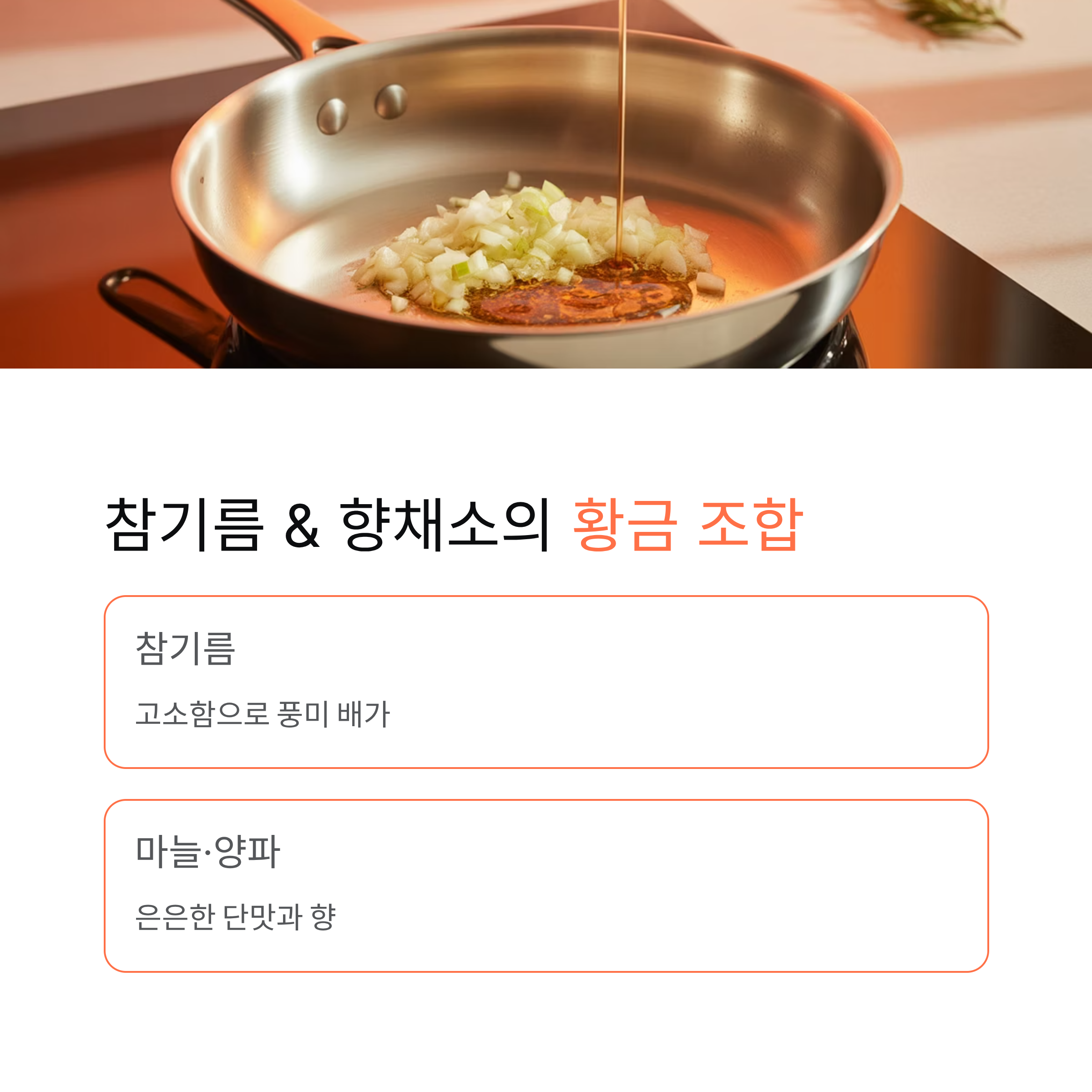 마지막에 살짝 두르는 참기름은 고소함을 끌어올려 풍미를 배가합니다.