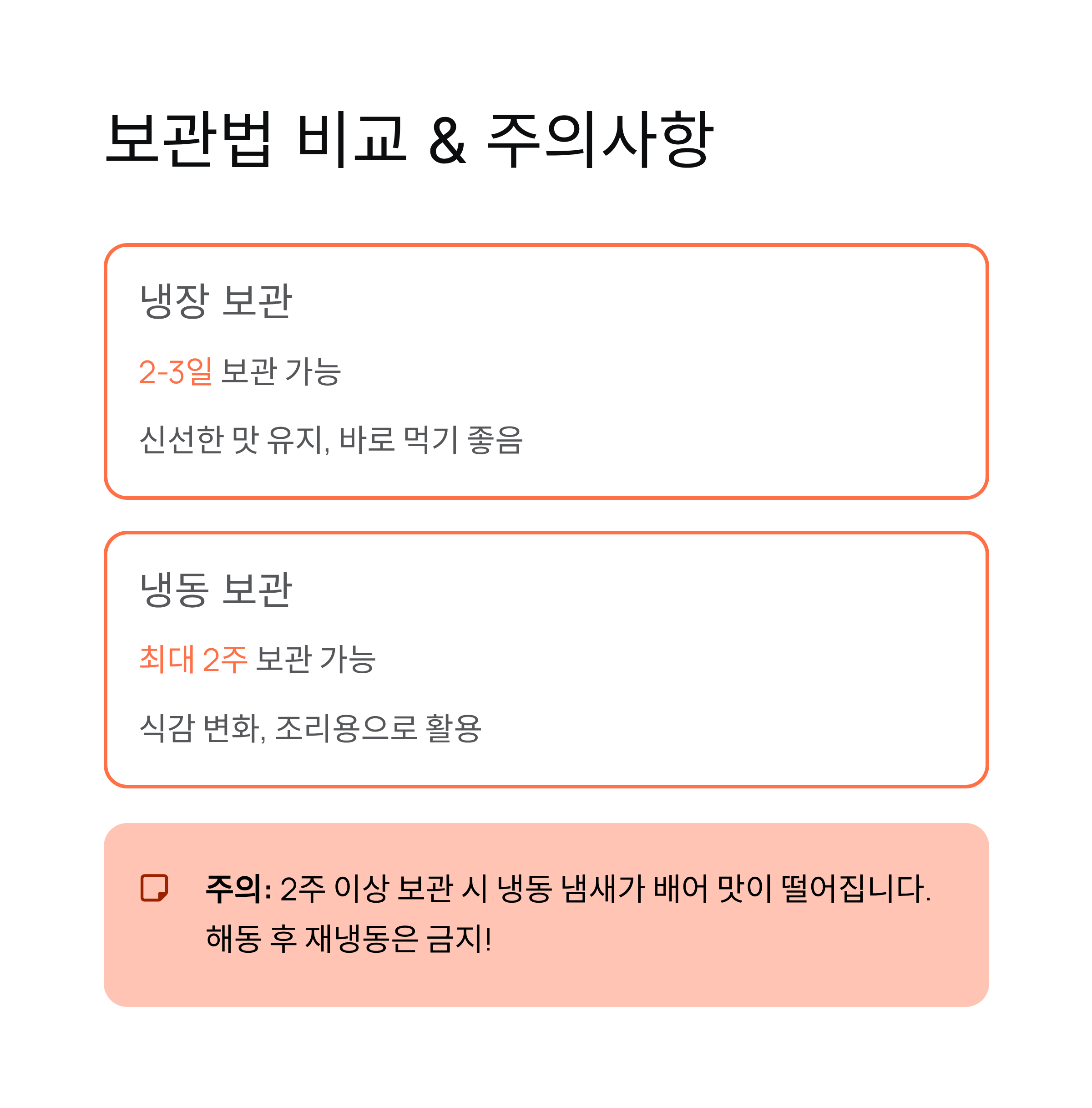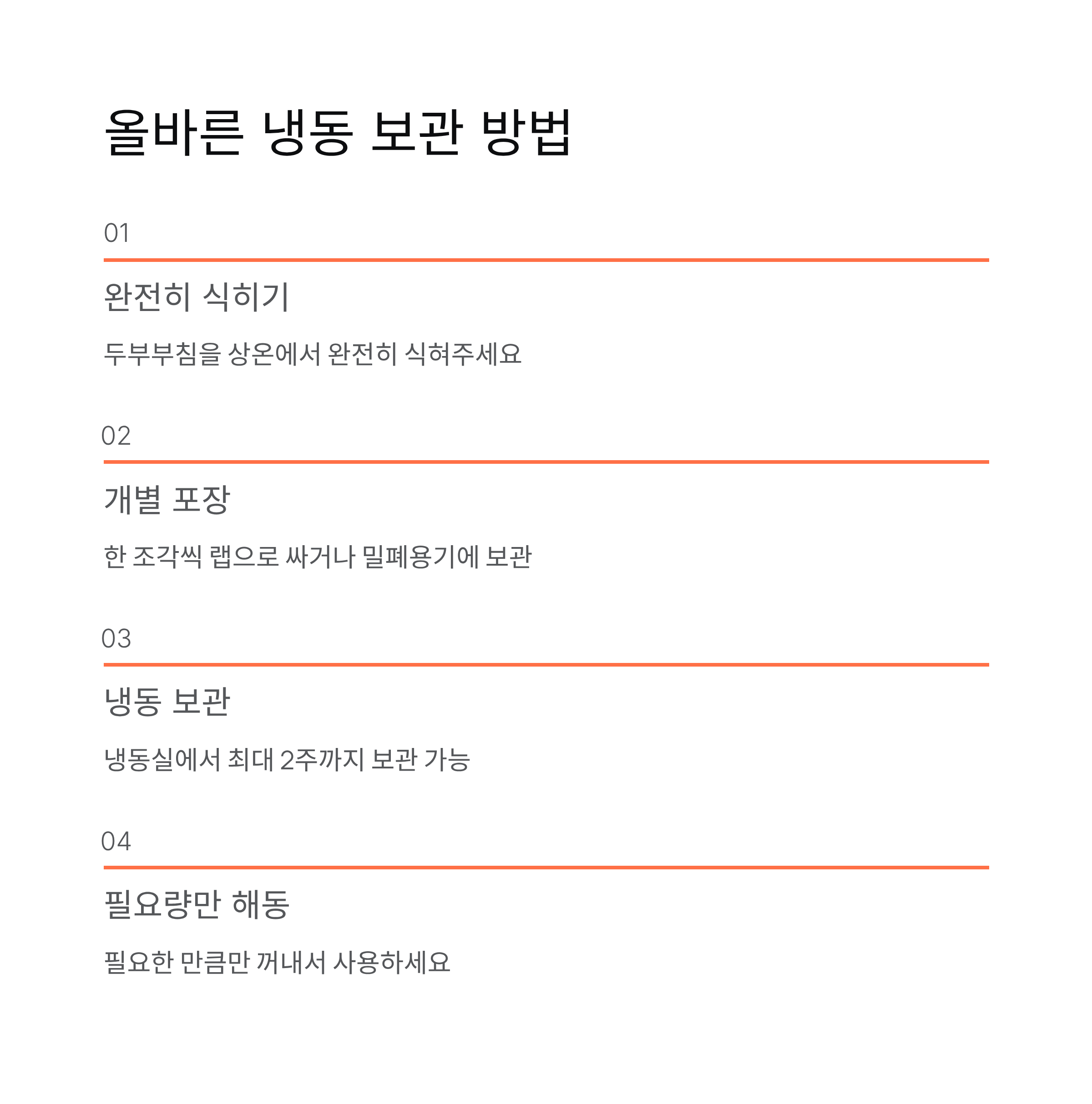 | 냉동 보관 | 최대 2주 | 식감이 단단해짐 | 조림, 찌개, 볶음 |