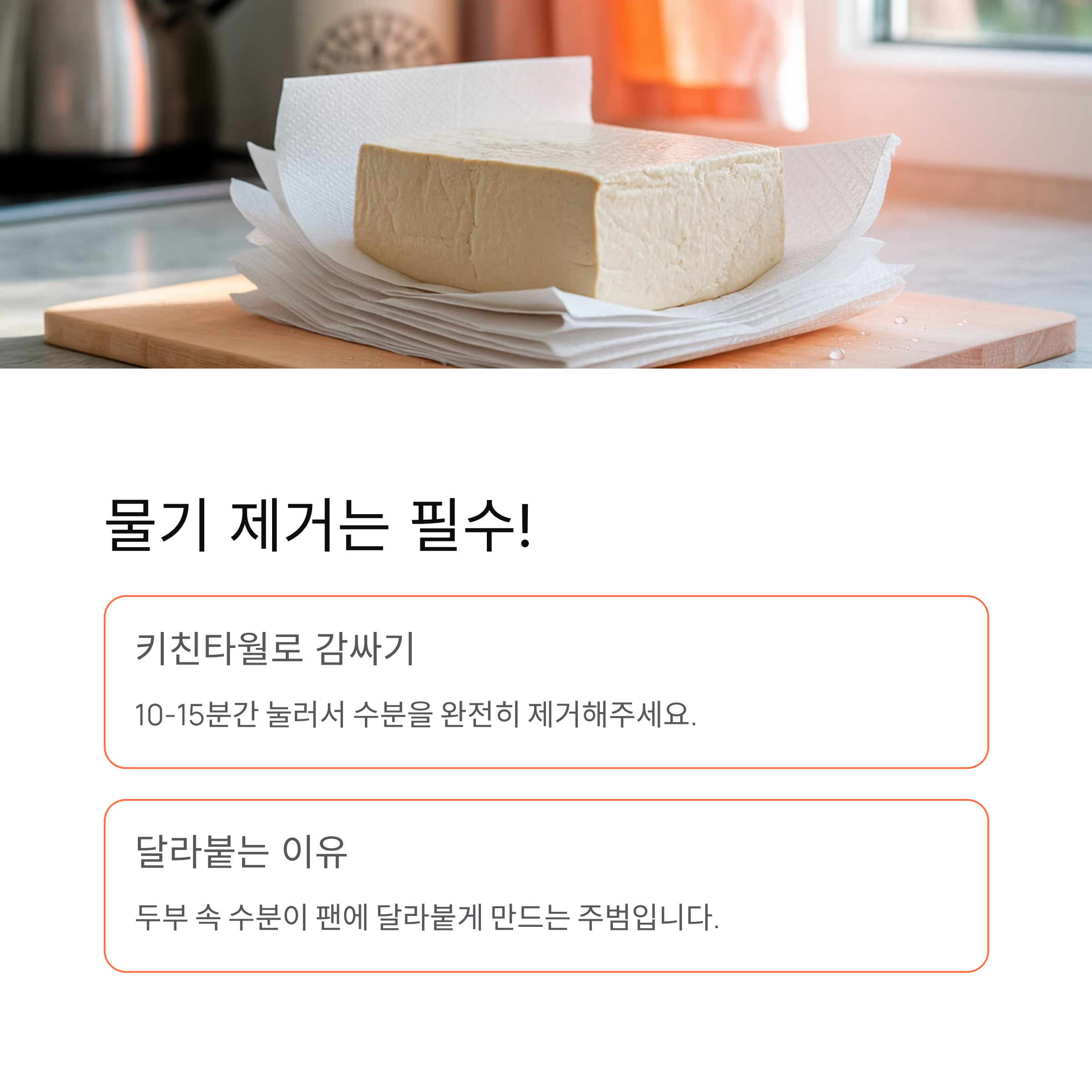 팬이 덜 달궈진 상태에서 두부를 올리면 기름과 팬 사이에 막이 형성되지 않아 잘 붙습니다.