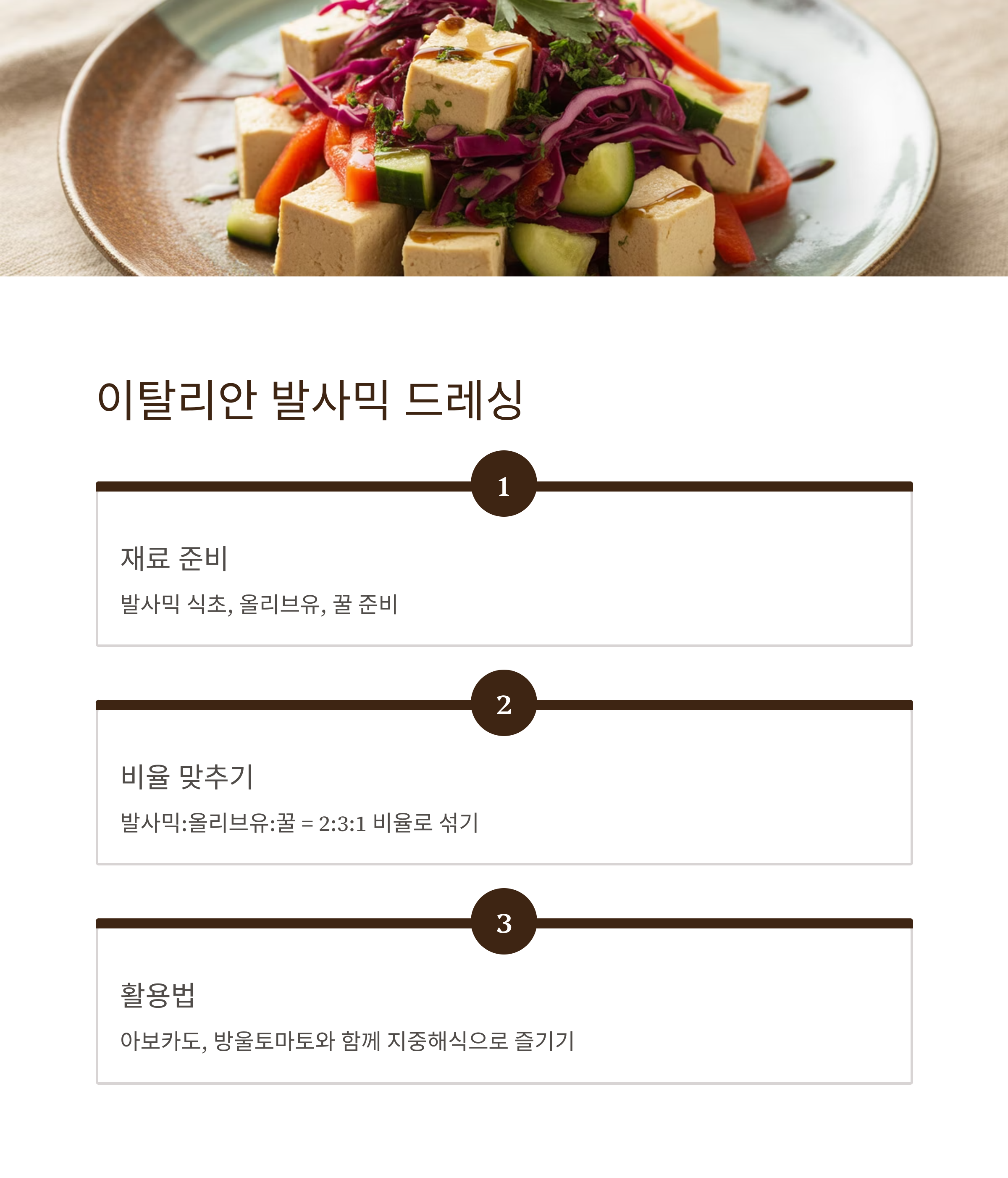 두부를 색다르게 즐기고 싶다면 발사믹 식초, 올리브유, 꿀을 섞은 이탈리안 스타일 드레싱을 활용하세요.