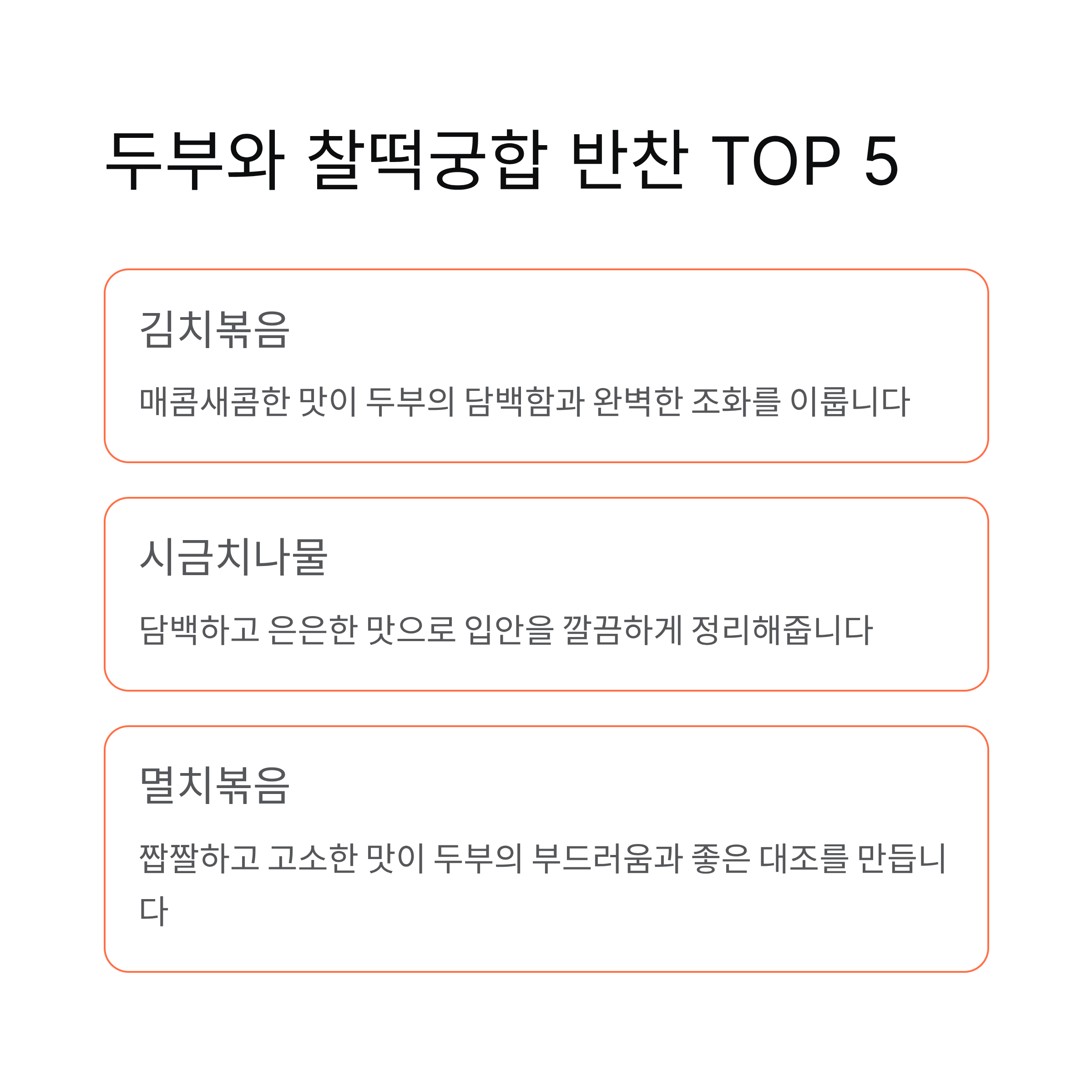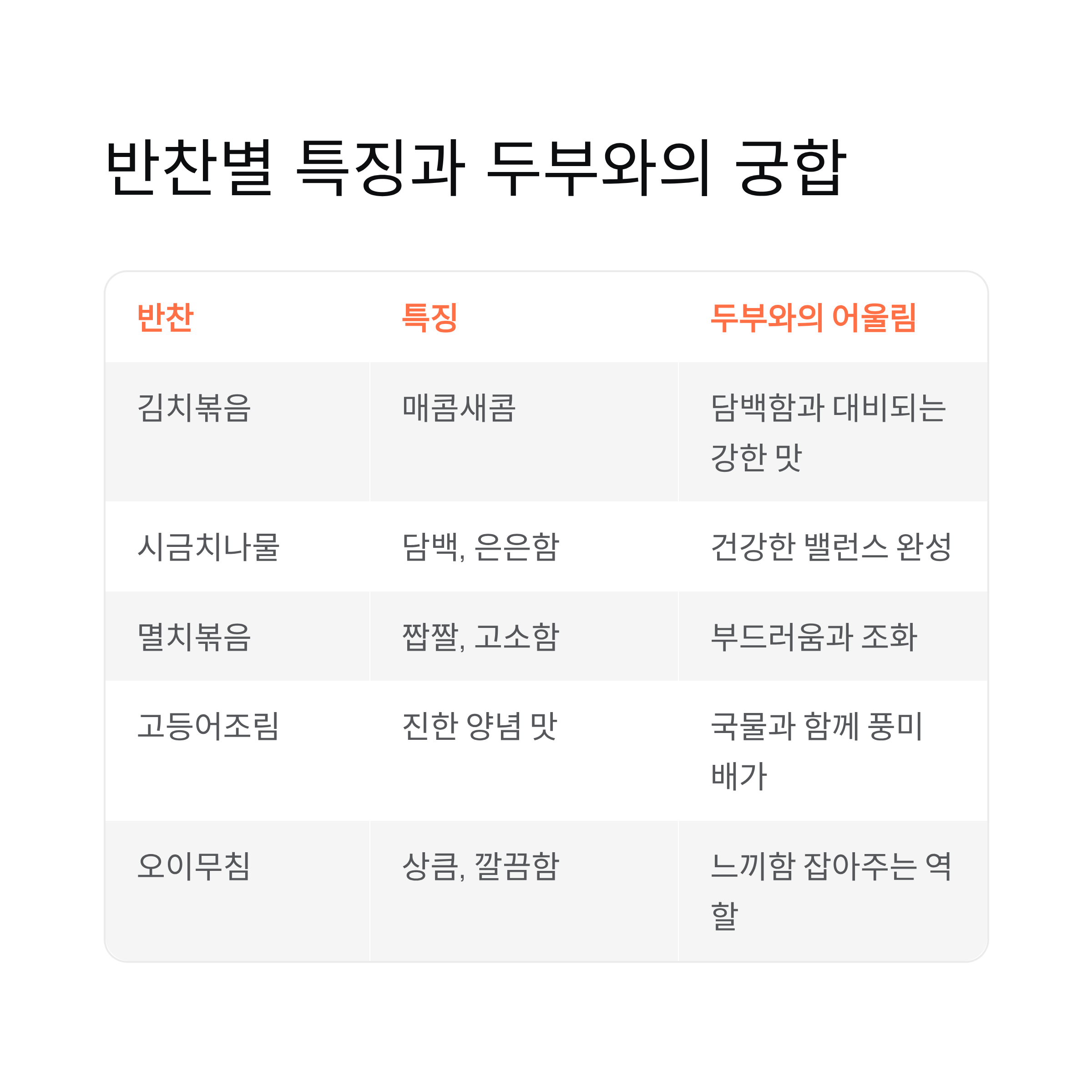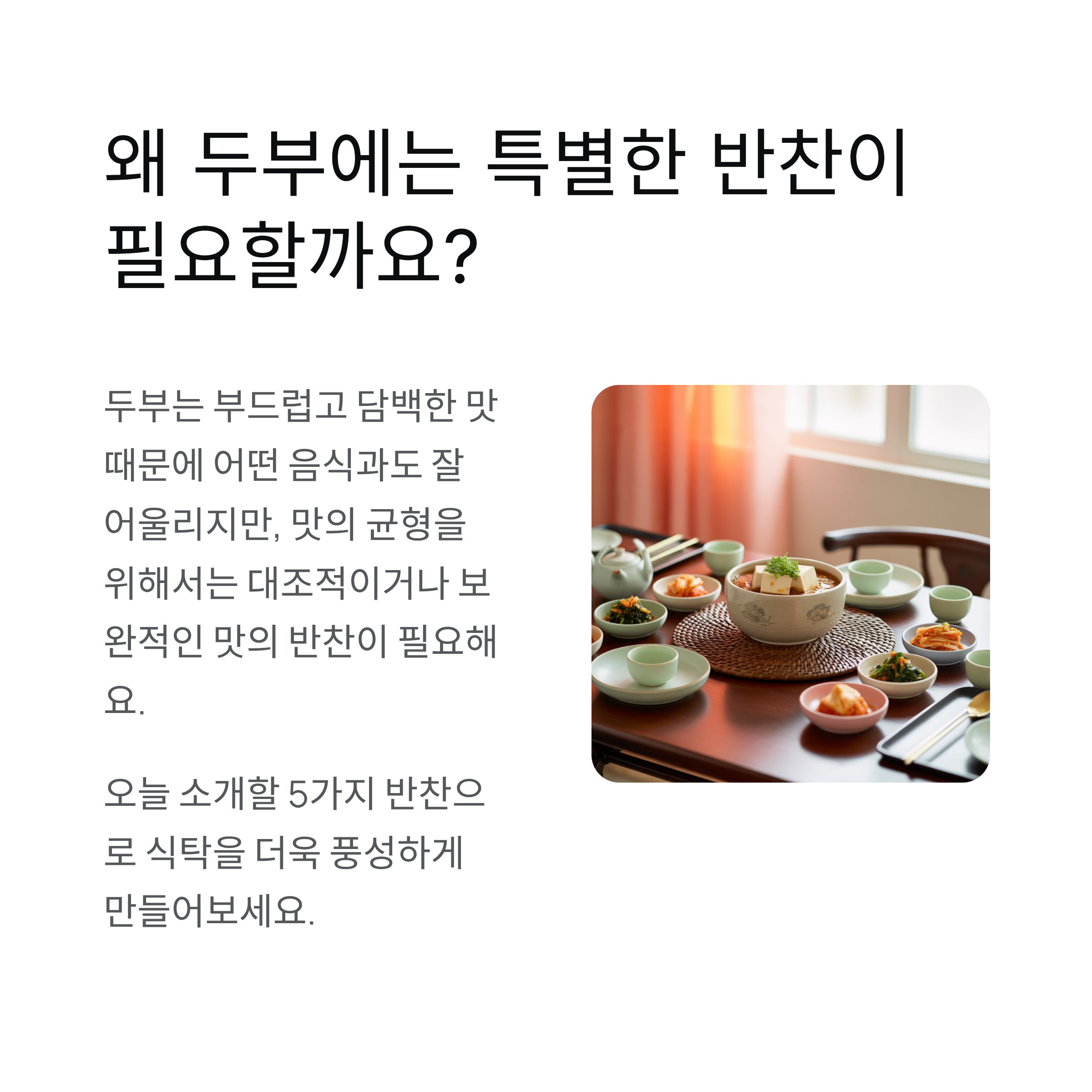 두부는 고소하고 부드러운 맛 덕분에 어떤 음식과도 잘 어울리지만, 특히 곁들이면 더 맛있어지는 반찬들이 있습니다.