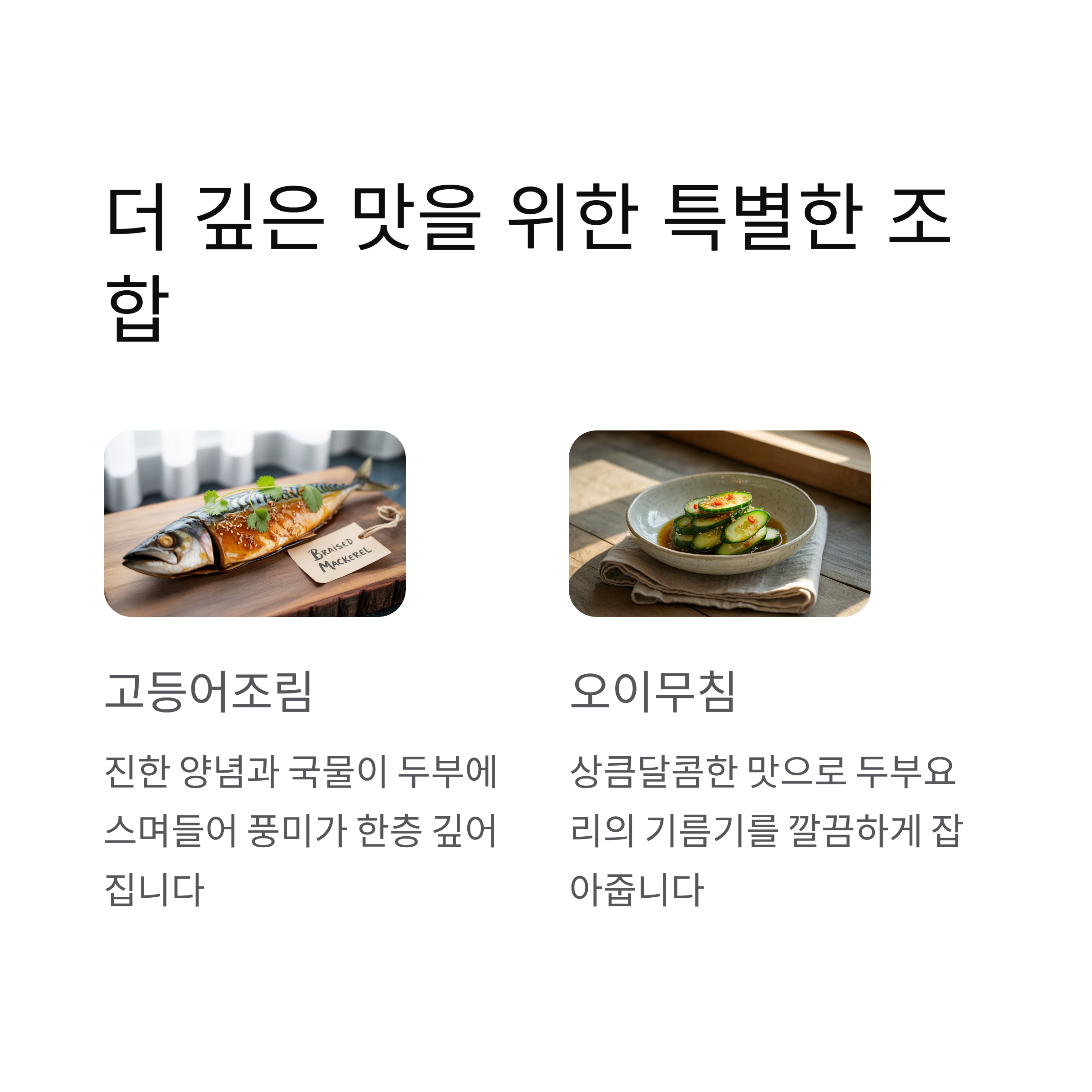 메인 반찬이든 곁들임이든 두부와 조화로운 반찬을 곁들이면 식탁이 훨씬 풍성해집니다.