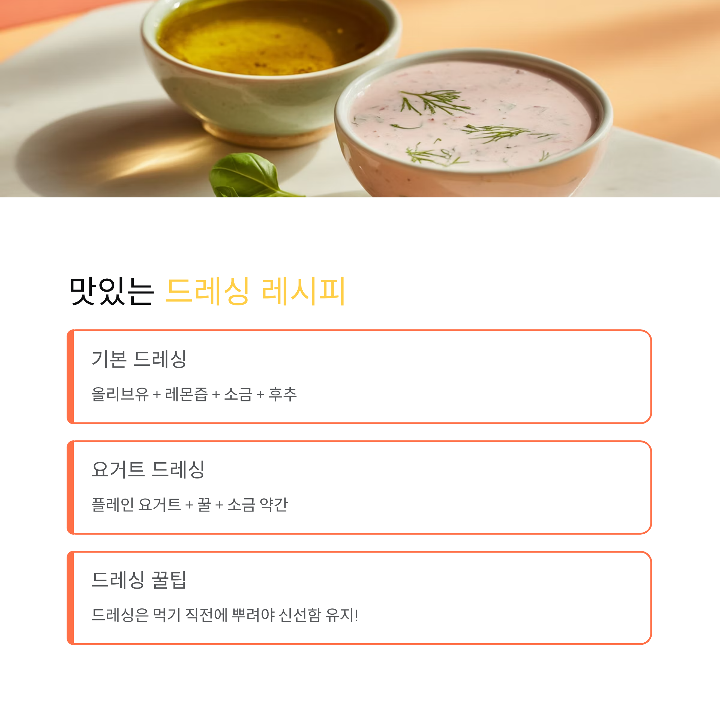 다양한 드레싱 아이디어는 만개의레시피 샐러드 모음에서 참고할 수 있습니다.