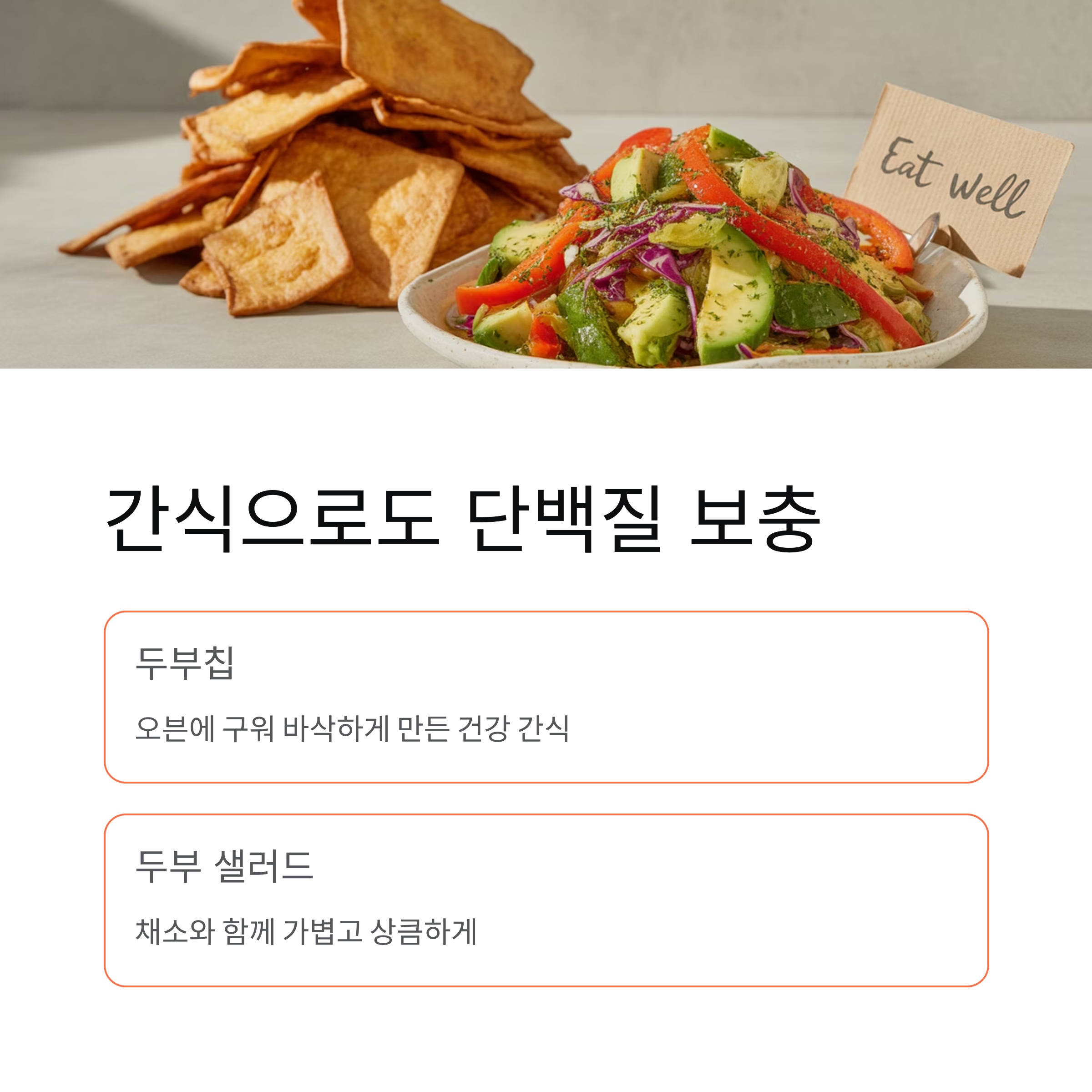 두부를 오븐에 구워 두부칩으로 만들거나, 두부 샐러드로 간단히 즐기면 간식까지 단백질 보충이 가능합니다.