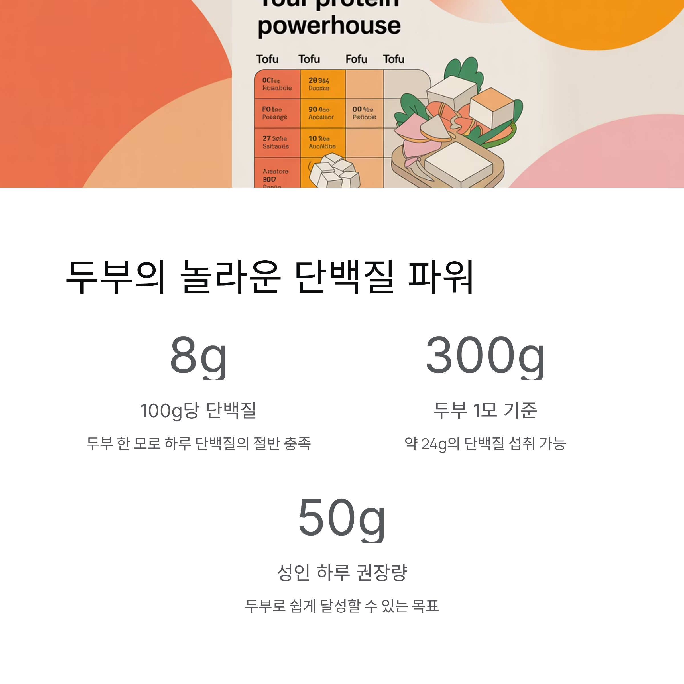 성인 하루 단백질 권장 섭취량이 약 50g 내외이므로, 두부 1모(약 300g)를 먹으면 단백질 섭취량의 큰 부분을 채울 수 있습니다.