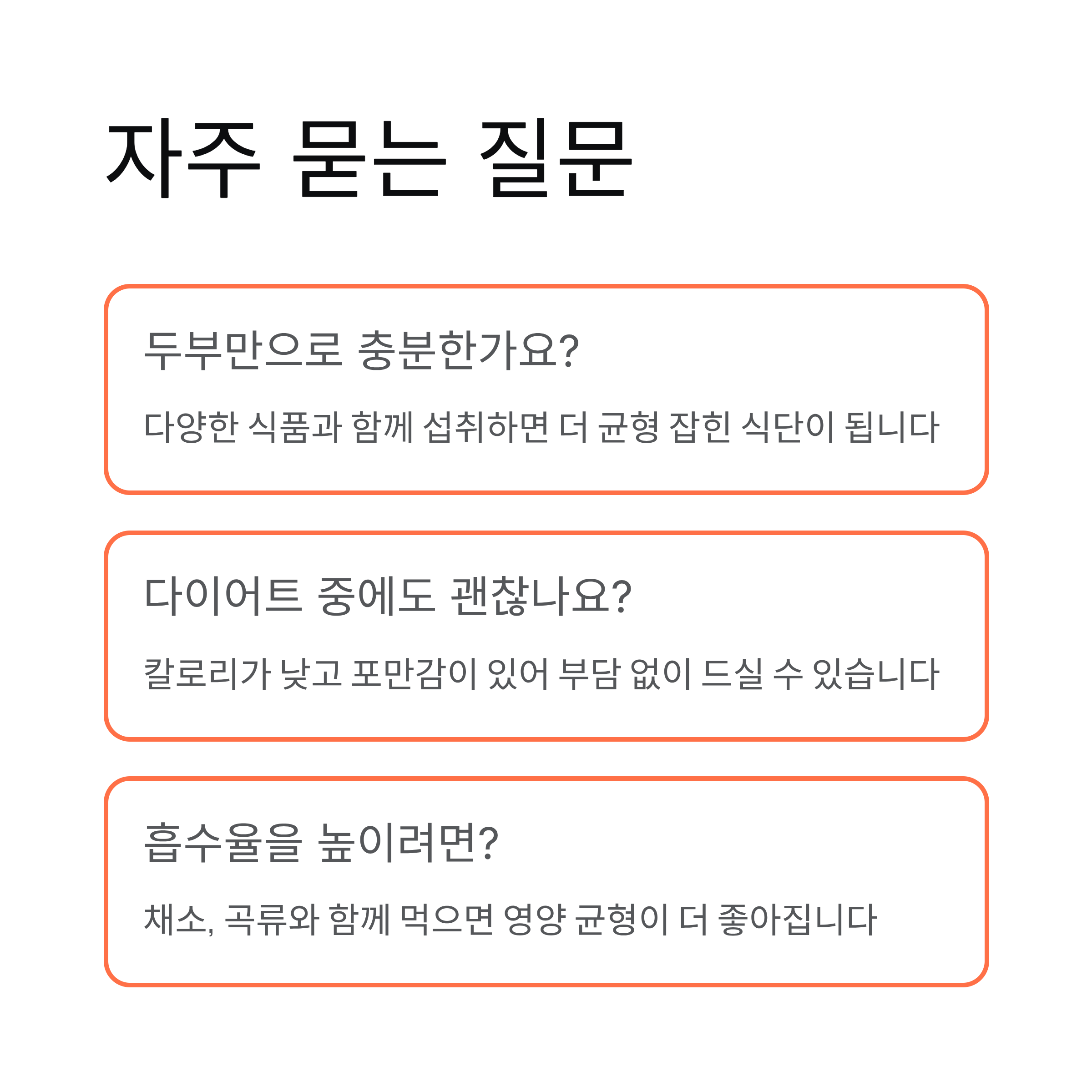 A. 두부가 좋은 단백질 공급원이긴 하지만, 다양한 식품과 함께 섭취하는 것이 더 균형 잡힌 식단이 됩니다.
