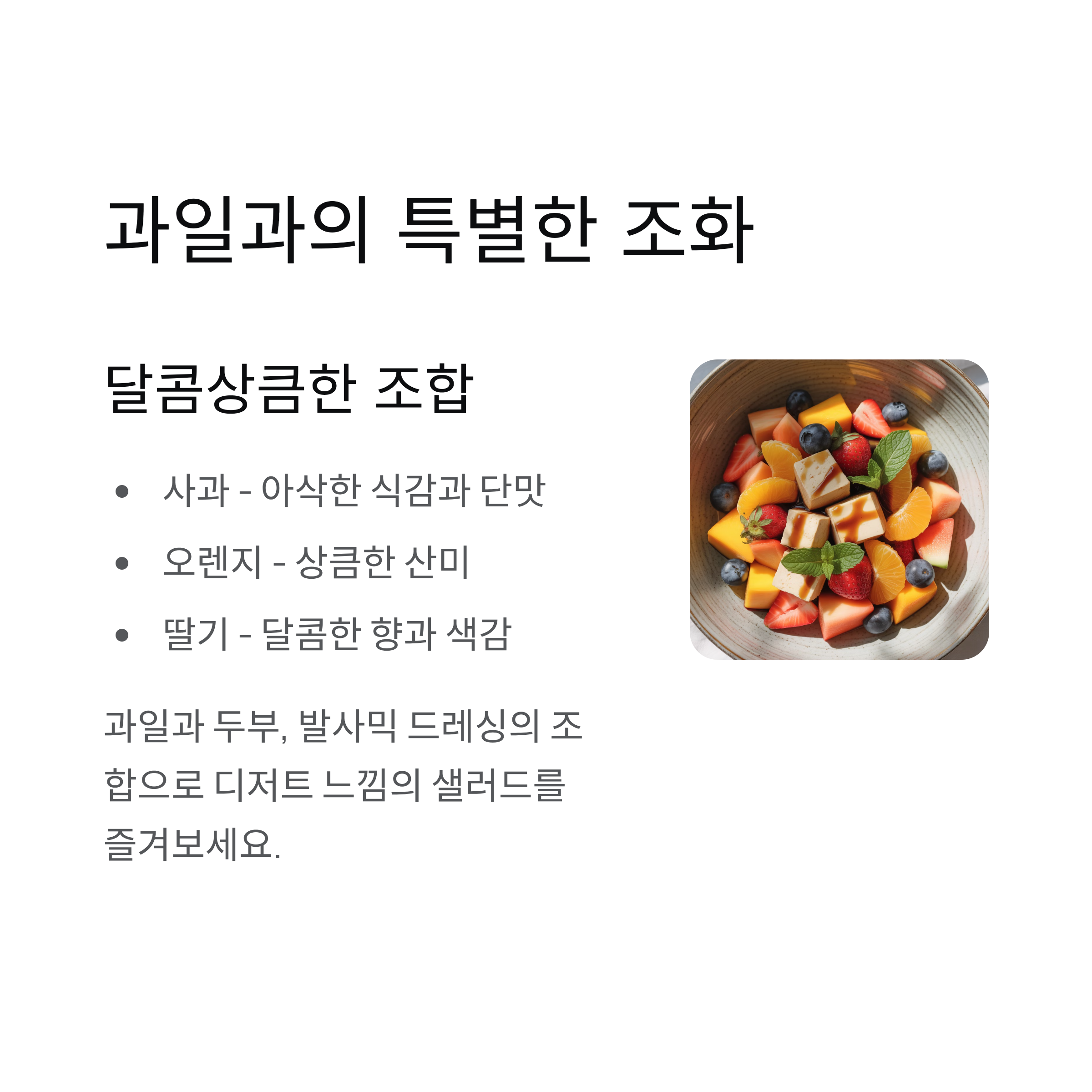 | 과일샐러드 | 두부 + 과일 + 드레싱 | 달콤·상큼한 색다른 조합 |