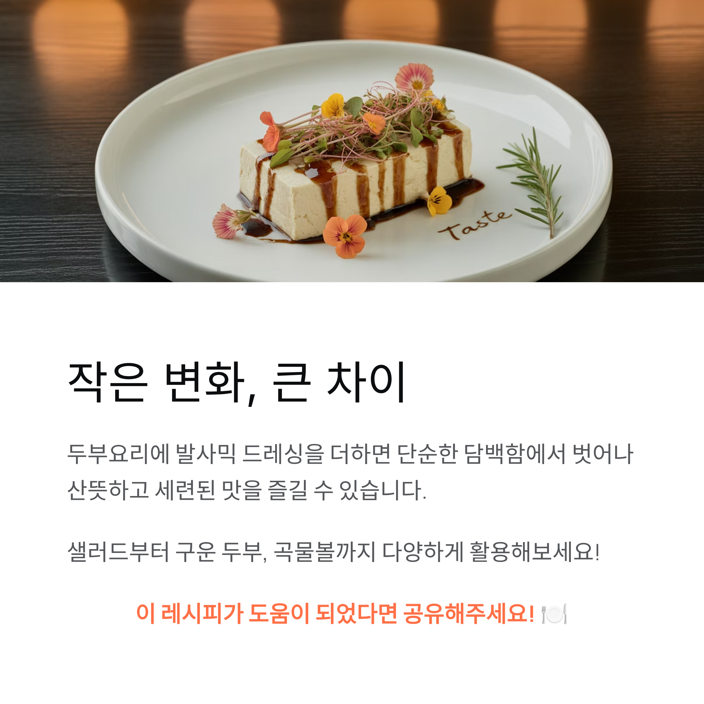 오늘은 두부요리에 발사믹 드레싱을 활용하는 방법과 어울리는 재료 조합을 소개하겠습니다.