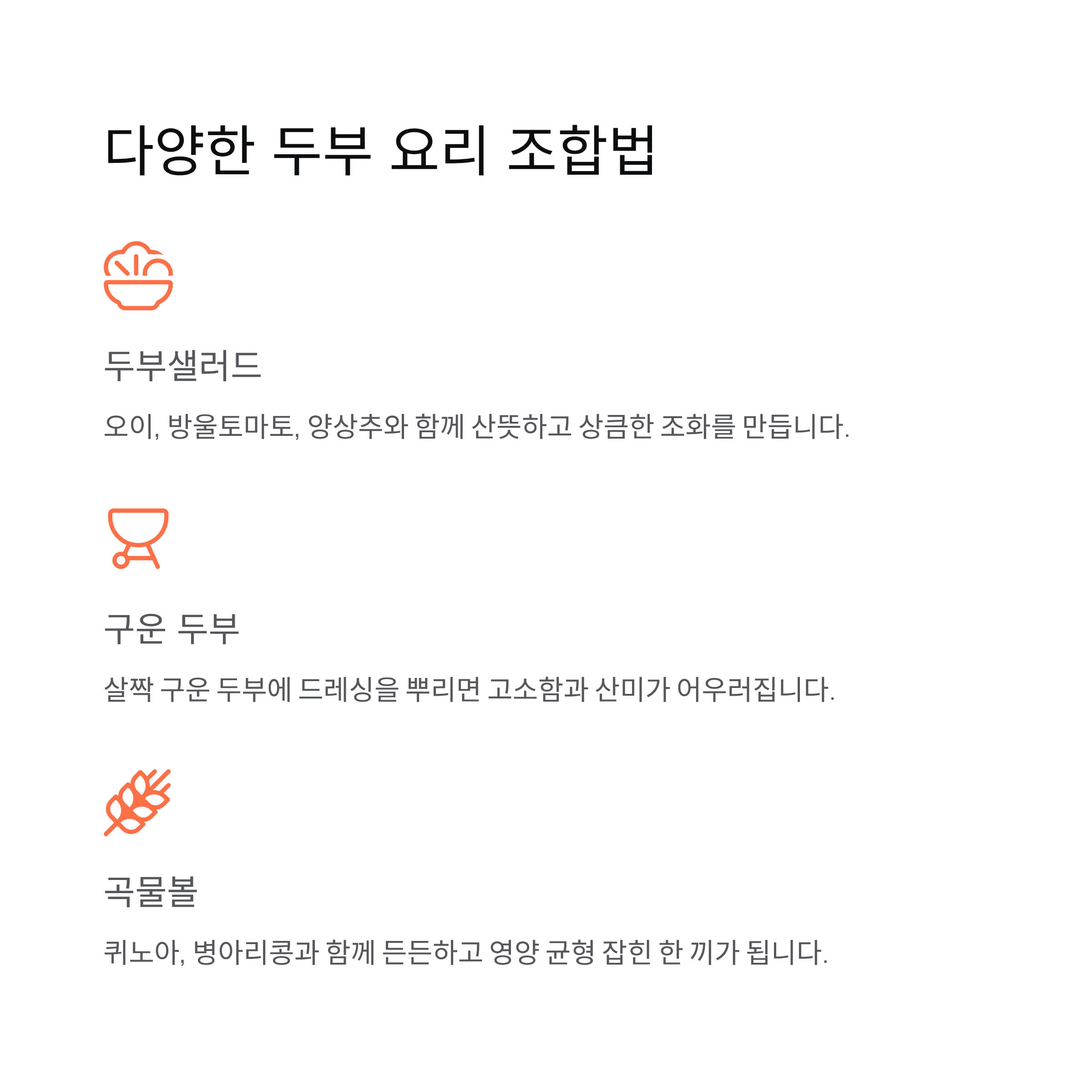 | 두부샐러드 | 생두부 + 채소 | 산뜻하고 상큼한 조화 |