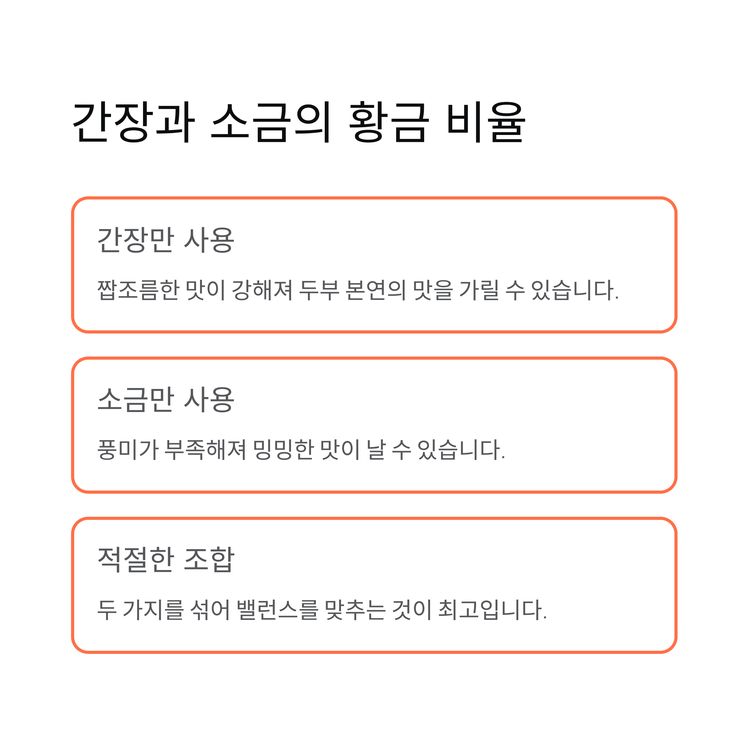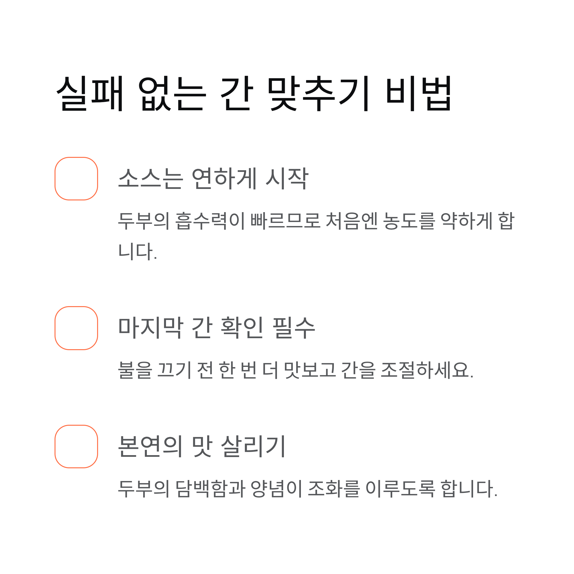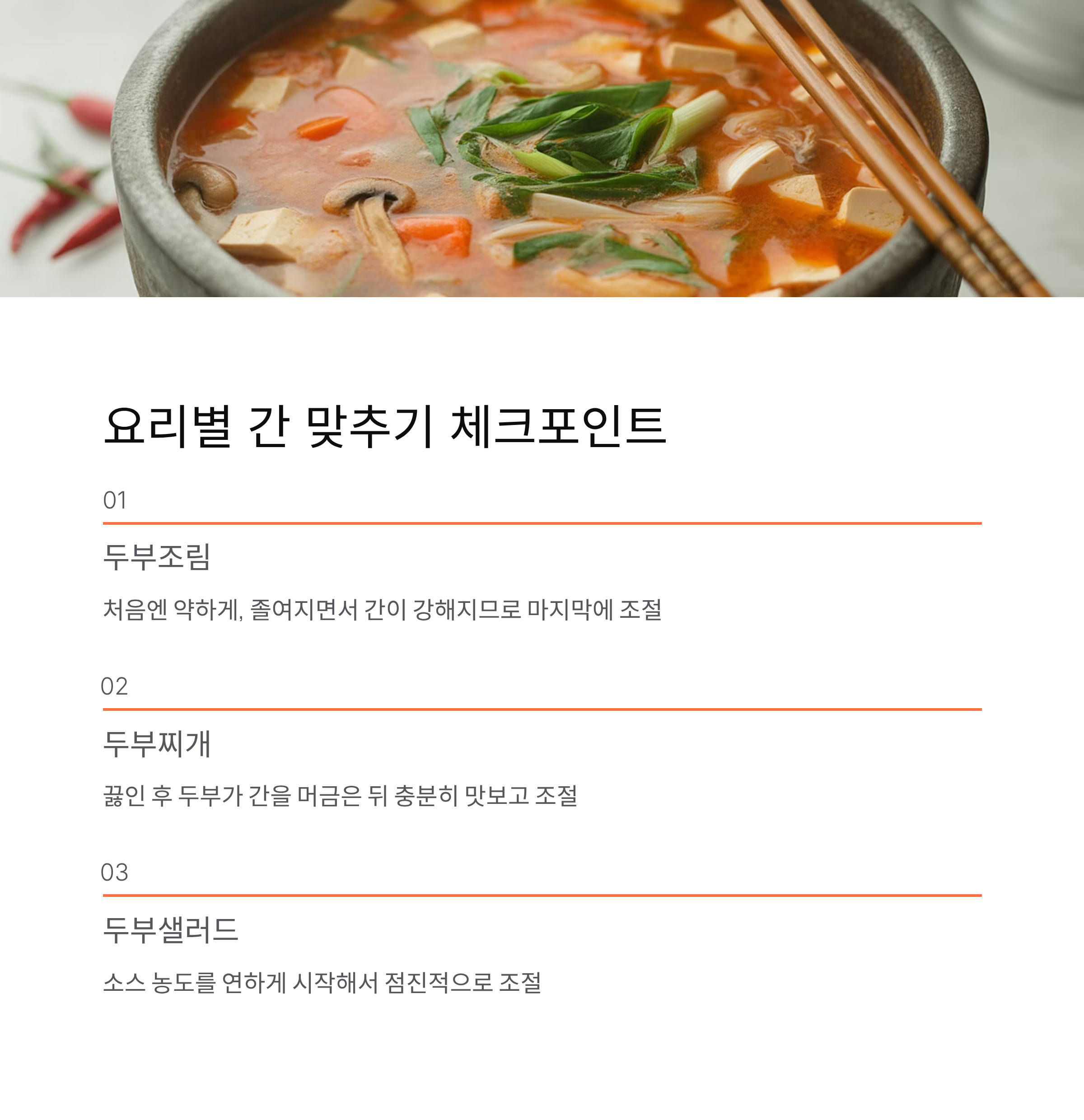 두부요리를 할 때 간을 잘 맞추기 위한 핵심 포인트를 정리해 보았습니다.
