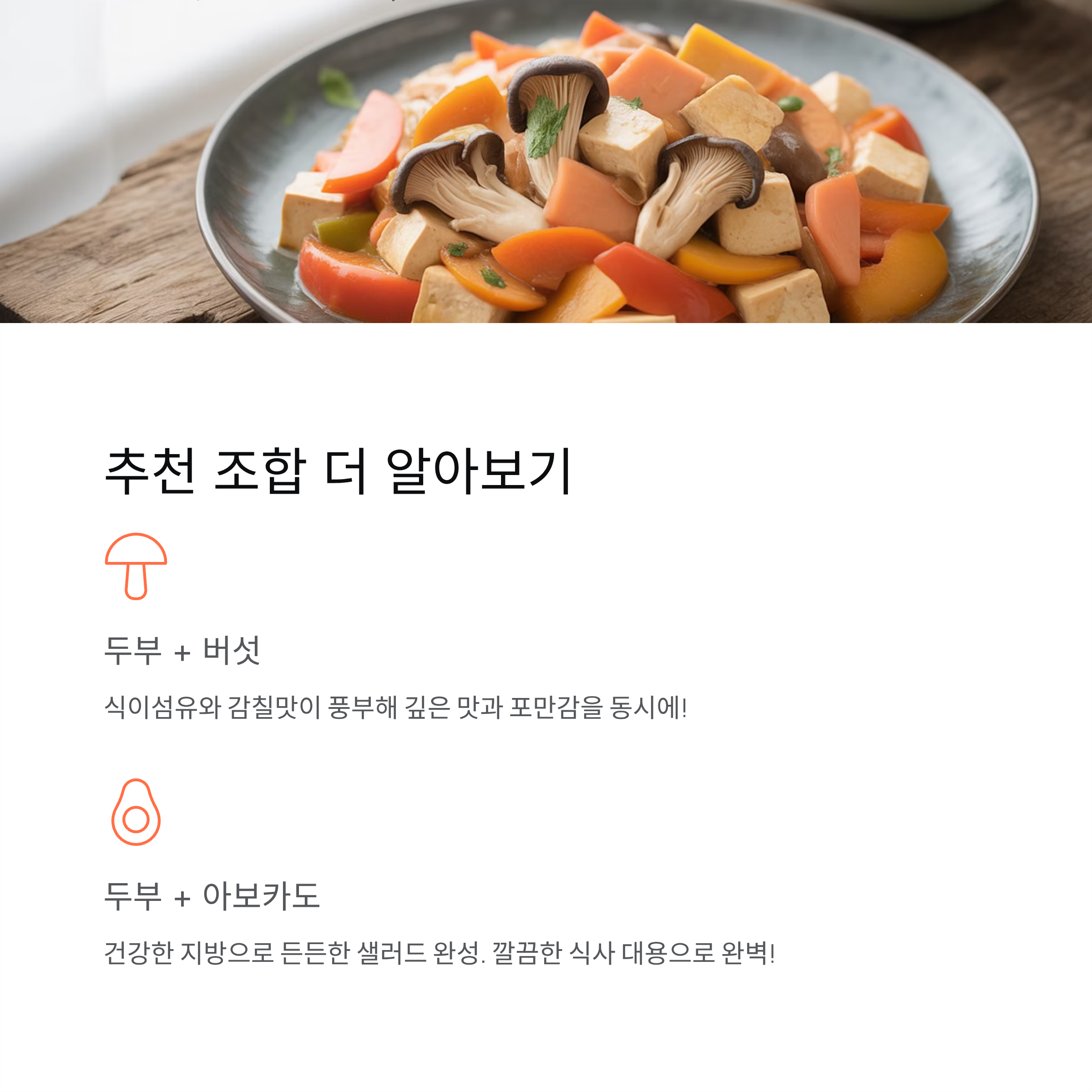 두부는 단독으로도 훌륭하지만, 포만감을 높이려면 곡물, 달걀, 감자, 버섯, 아보카도 같은 재료와 함께하면 좋습니다.