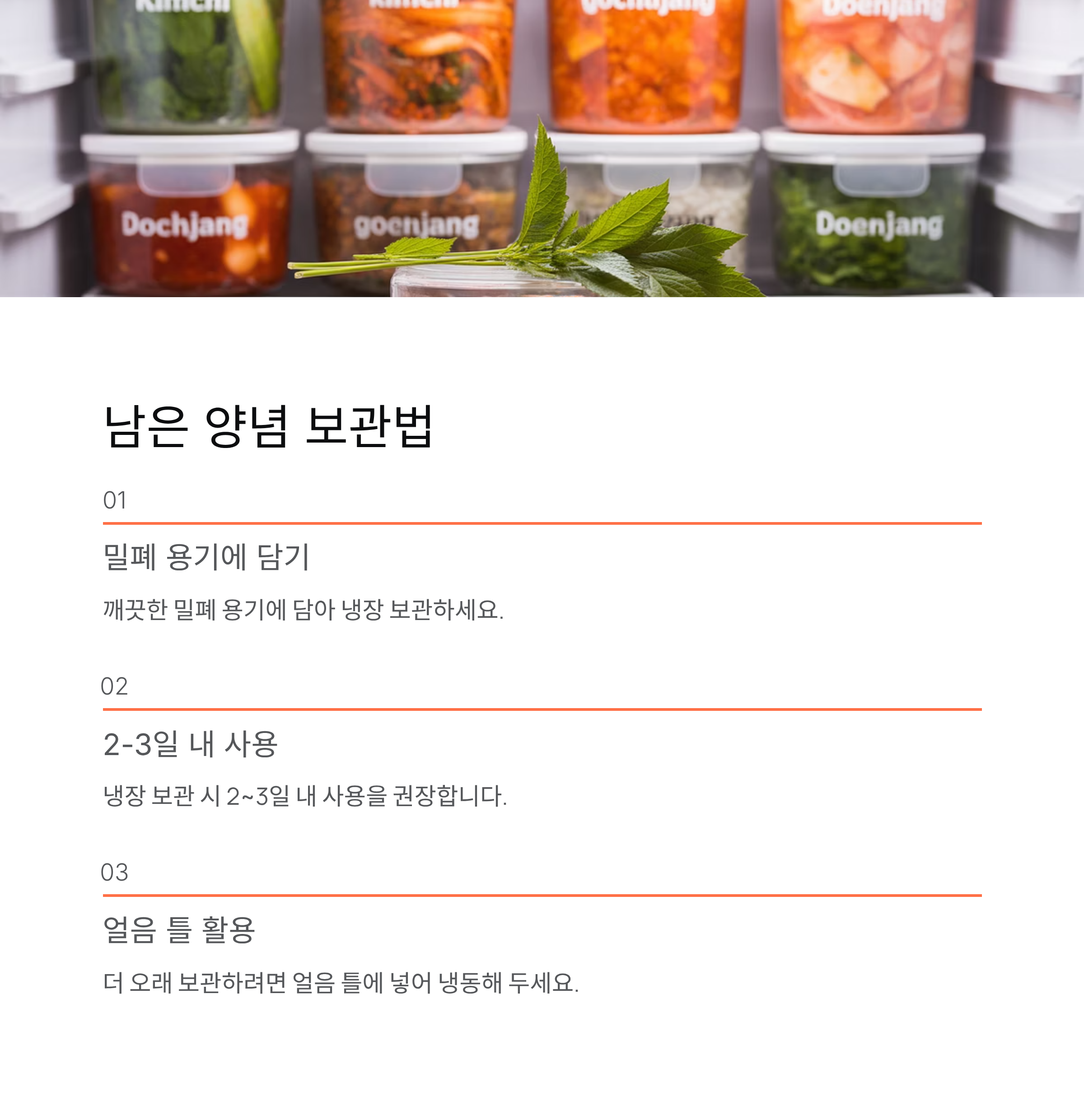 남은 양념을 냉장 보관하면 2~3일 정도는 충분히 사용할 수 있습니다.
