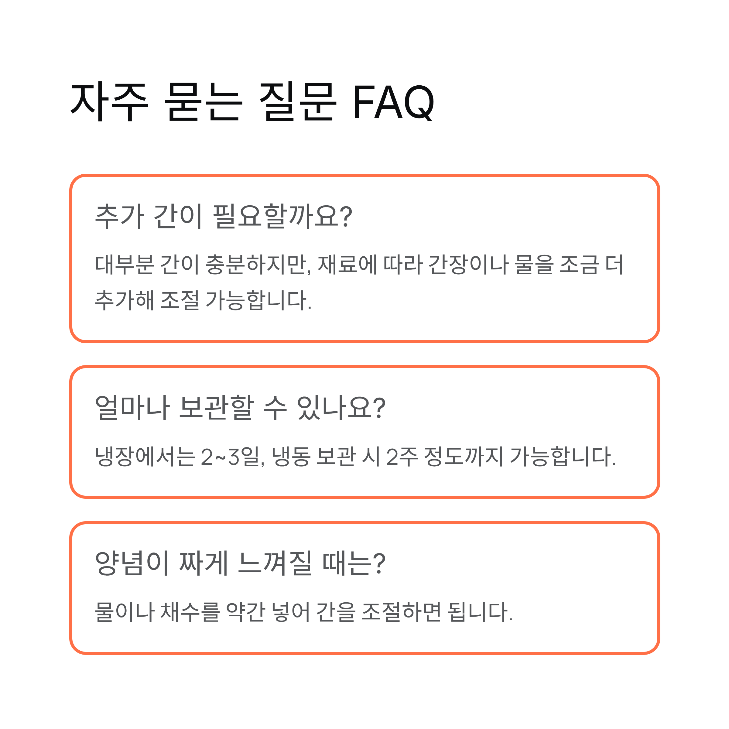 A. 대부분의 경우 간이 충분하지만, 재료에 따라 간장이나 물을 조금 더 추가해 조절할 수 있습니다.