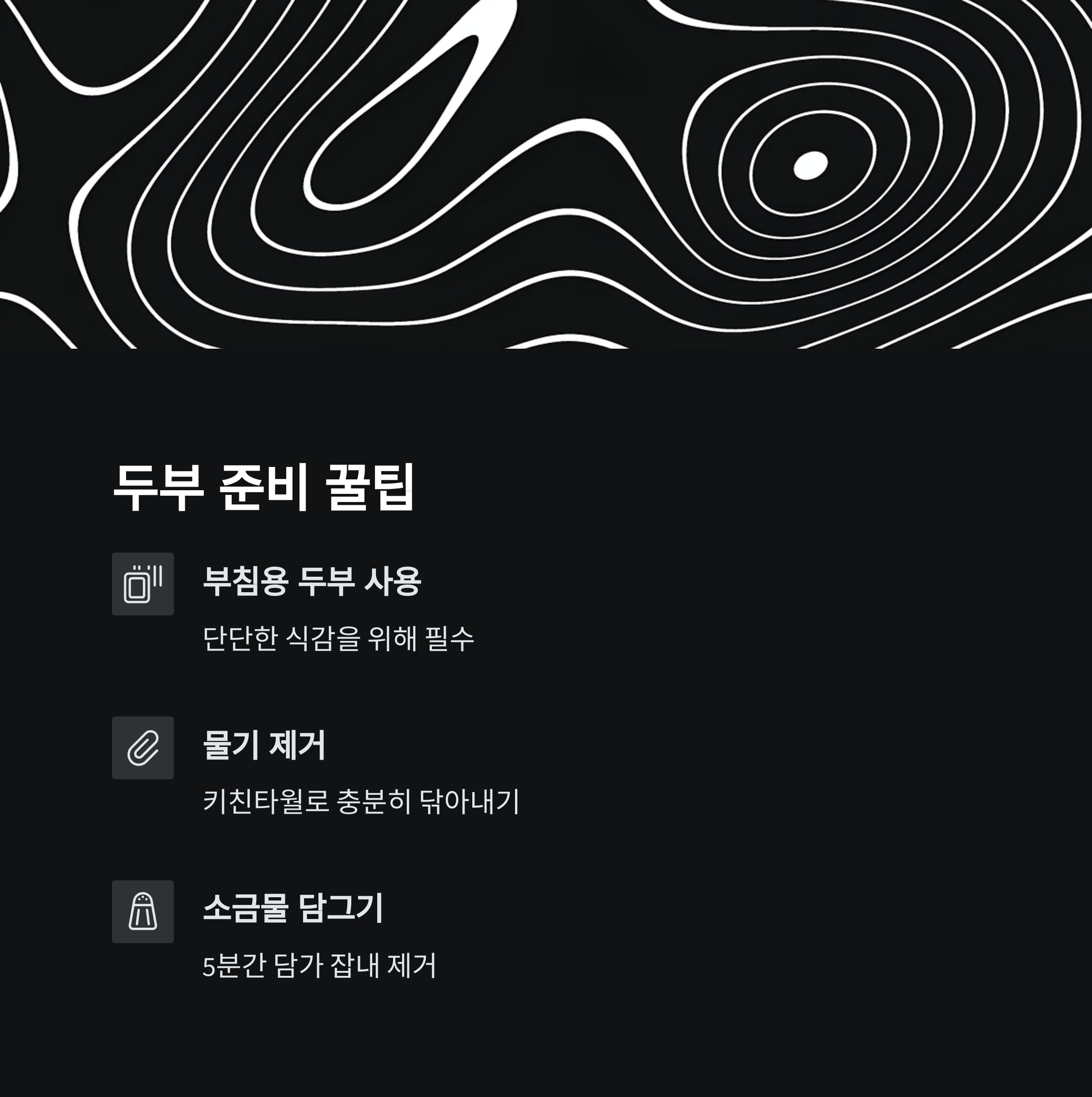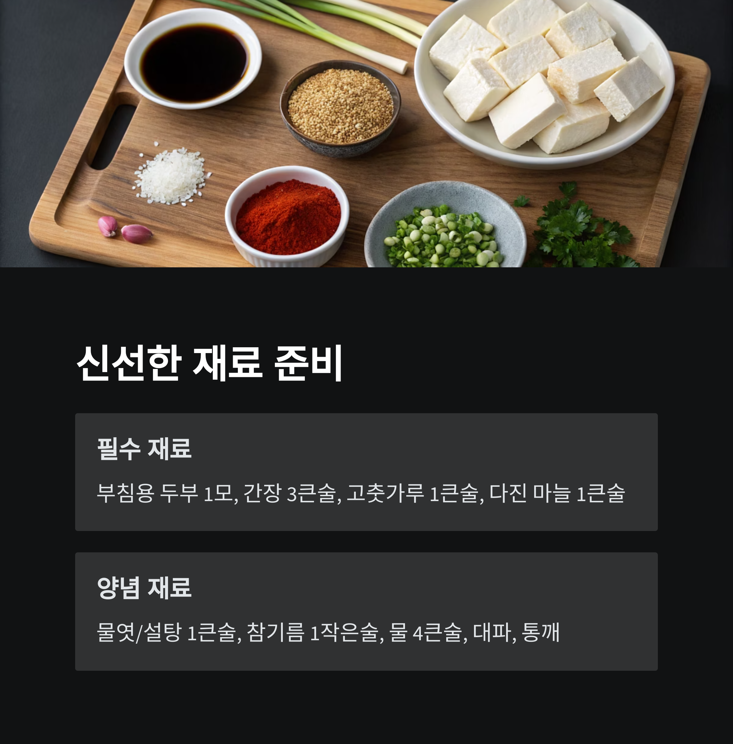 - 두부는 미리 소금물에 5분 담갔다가 물기를 빼면 잡내 없이 담백한 맛 강화