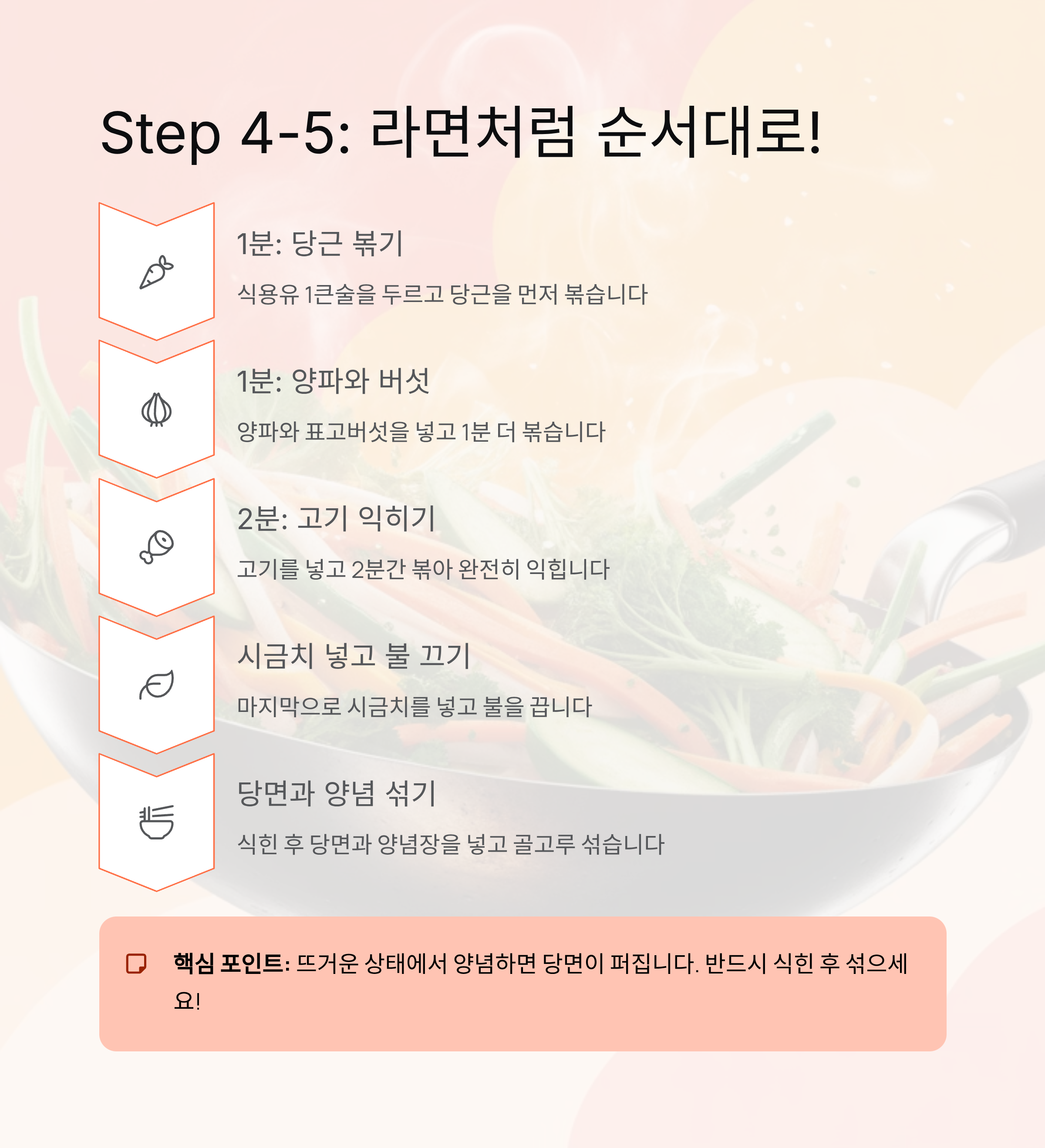 이 순서 그대로만 하면 재료마다 식감이 살아있고, 맛이 균형 있게 어우러집니다.
