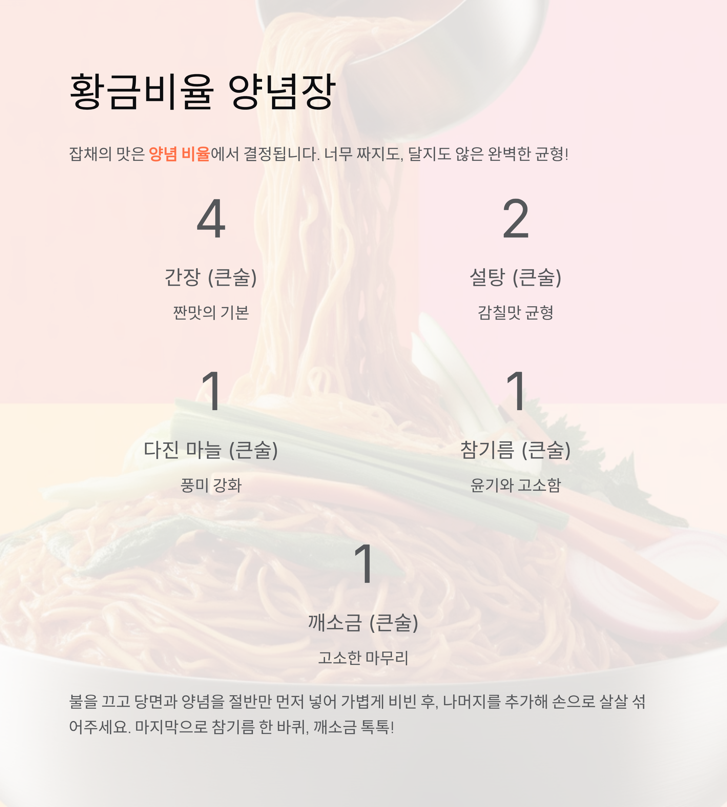 이 황금레시피 하나면 요리 초보도 실패 없이 완벽한 잡채를 만들 수 있어요.