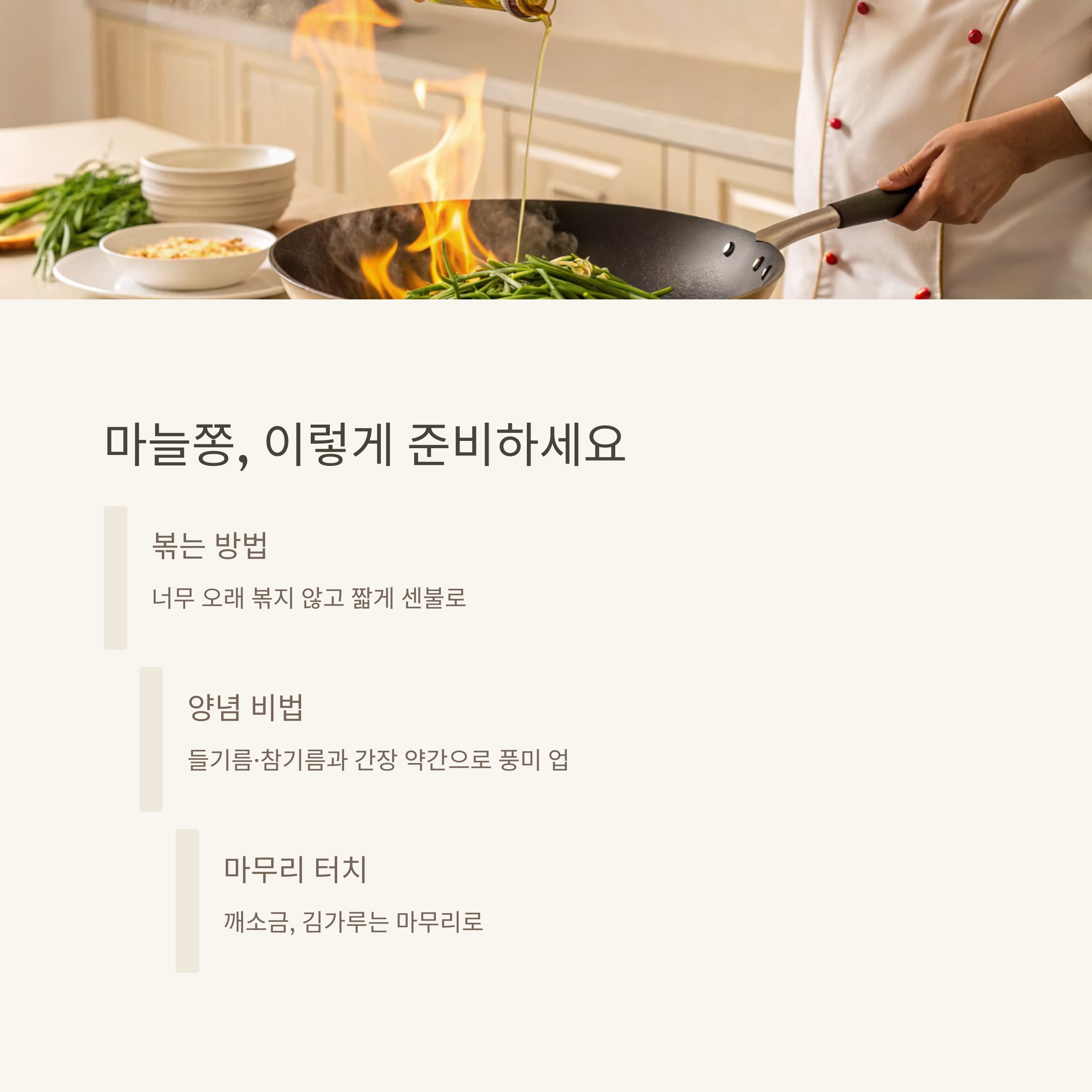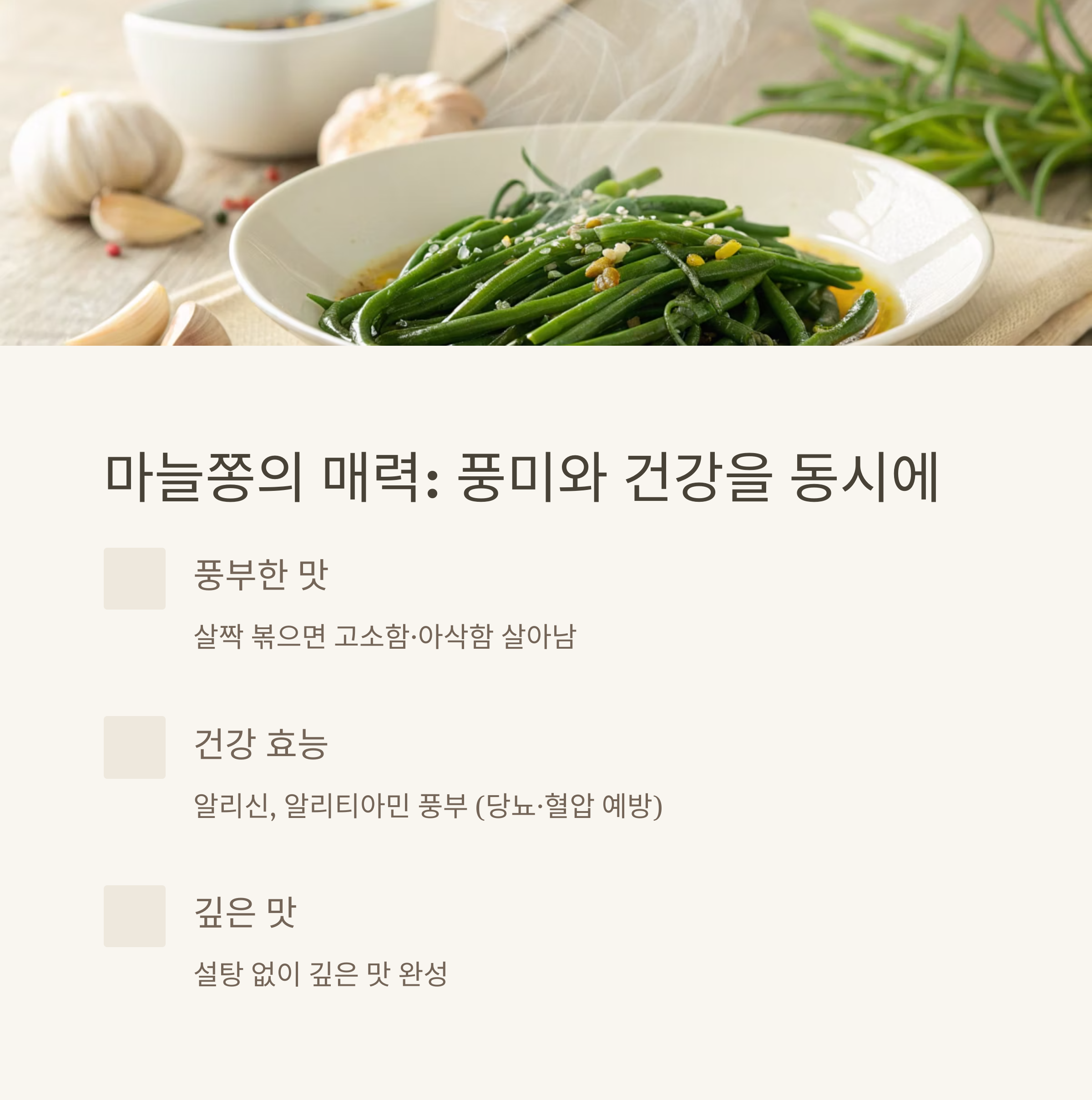 👉 마늘쫑은 볶을 때 불을 세지 않게 하여 초록빛과 식감을 유지하는 것이 핵심