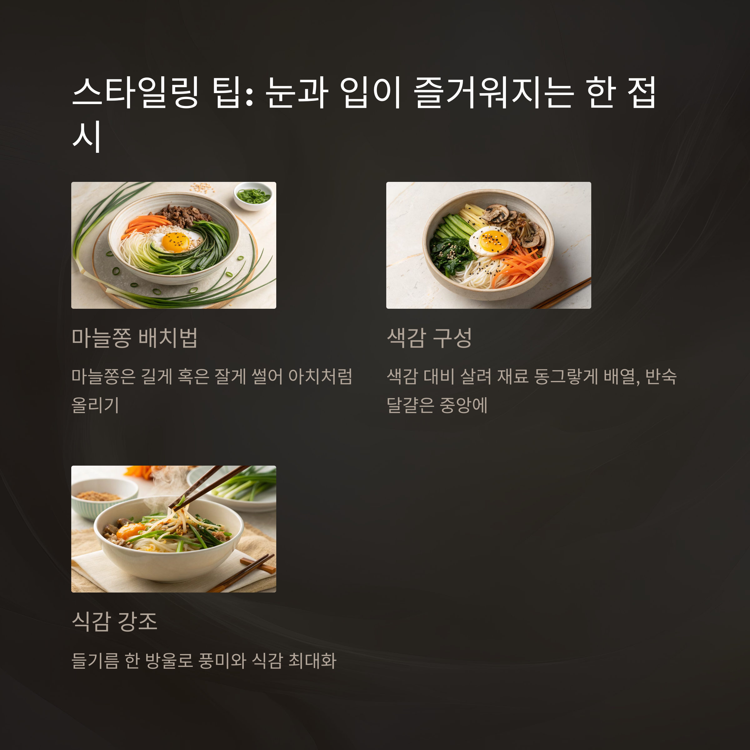 - 볶은 마늘쫑은 비빔밥 중앙에 고명처럼 얹어 스타일 강조