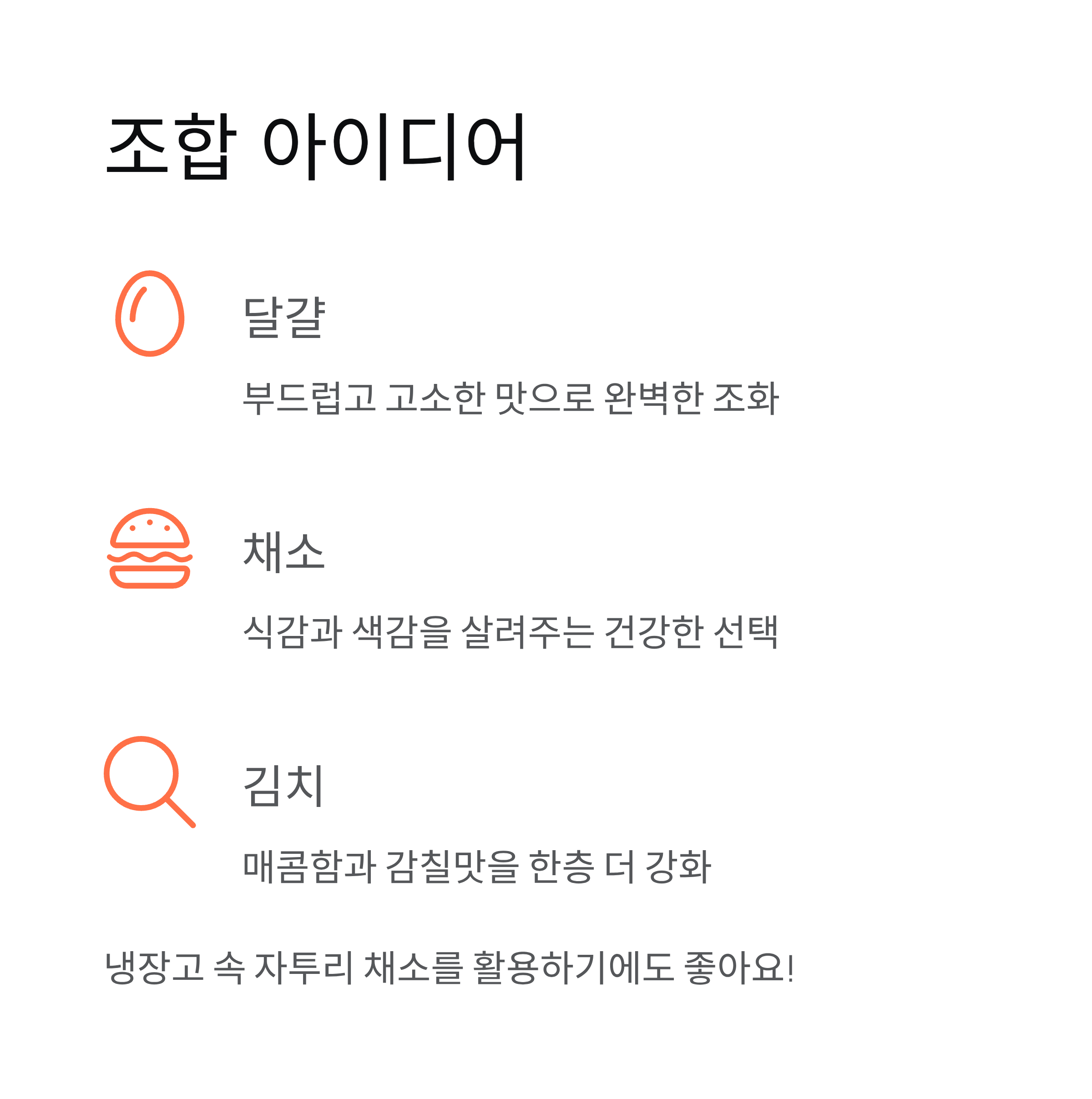 | 김치 | 매콤함과 감칠맛 강화 |