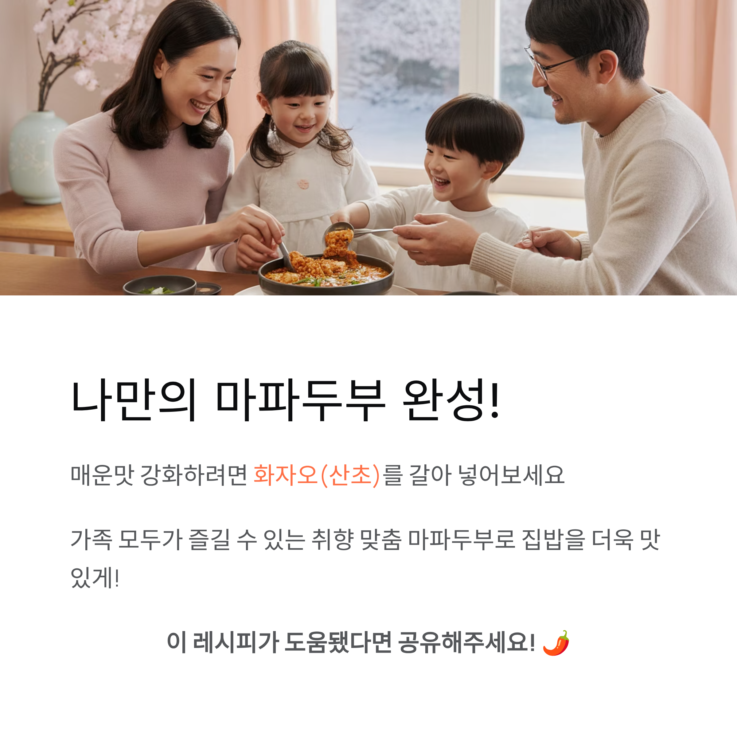 가족 식탁에서도, 혼자 먹는 집밥에서도 각자 입맛에 맞게 조정해 나만의 마파두부를 즐겨보세요.