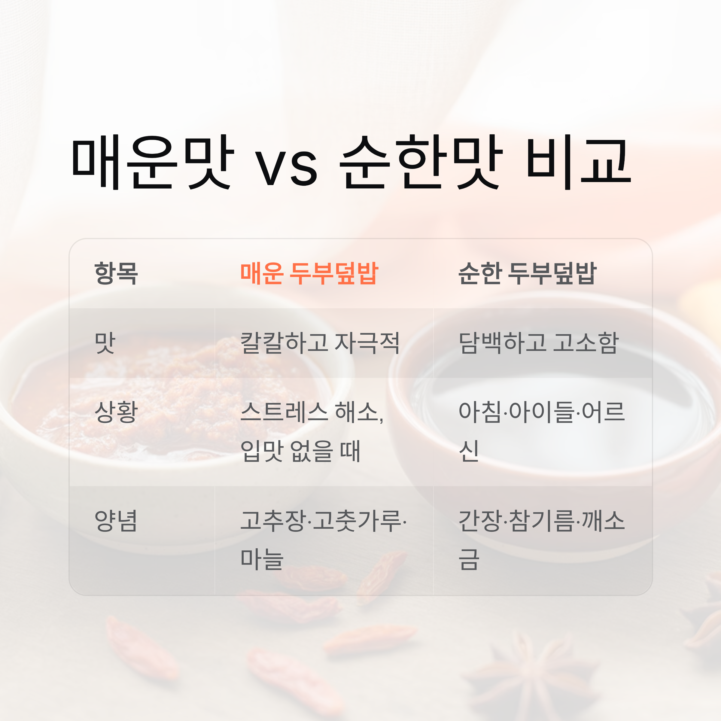 오늘은 두부덮밥의 두 가지 스타일을 비교하고, 상황별 선택 가이드를 알려드립니다.