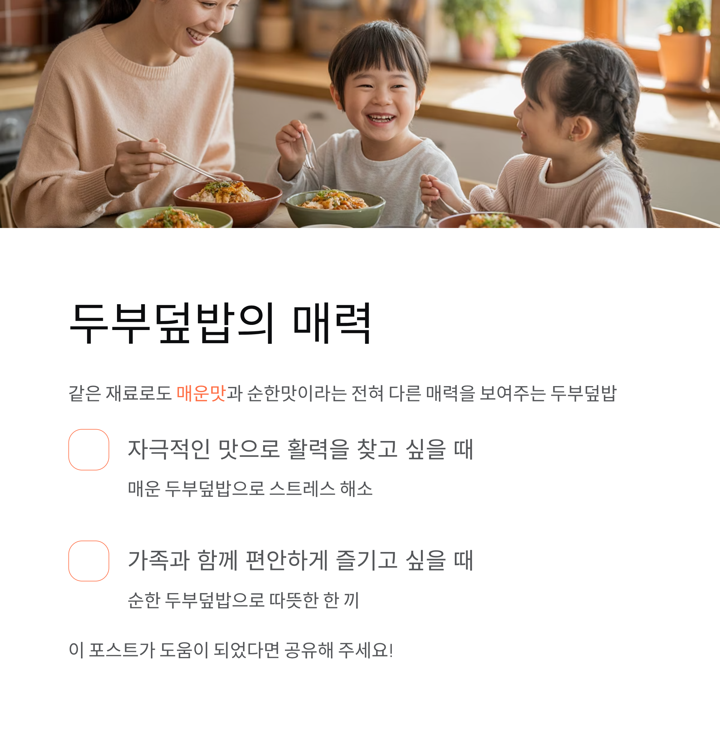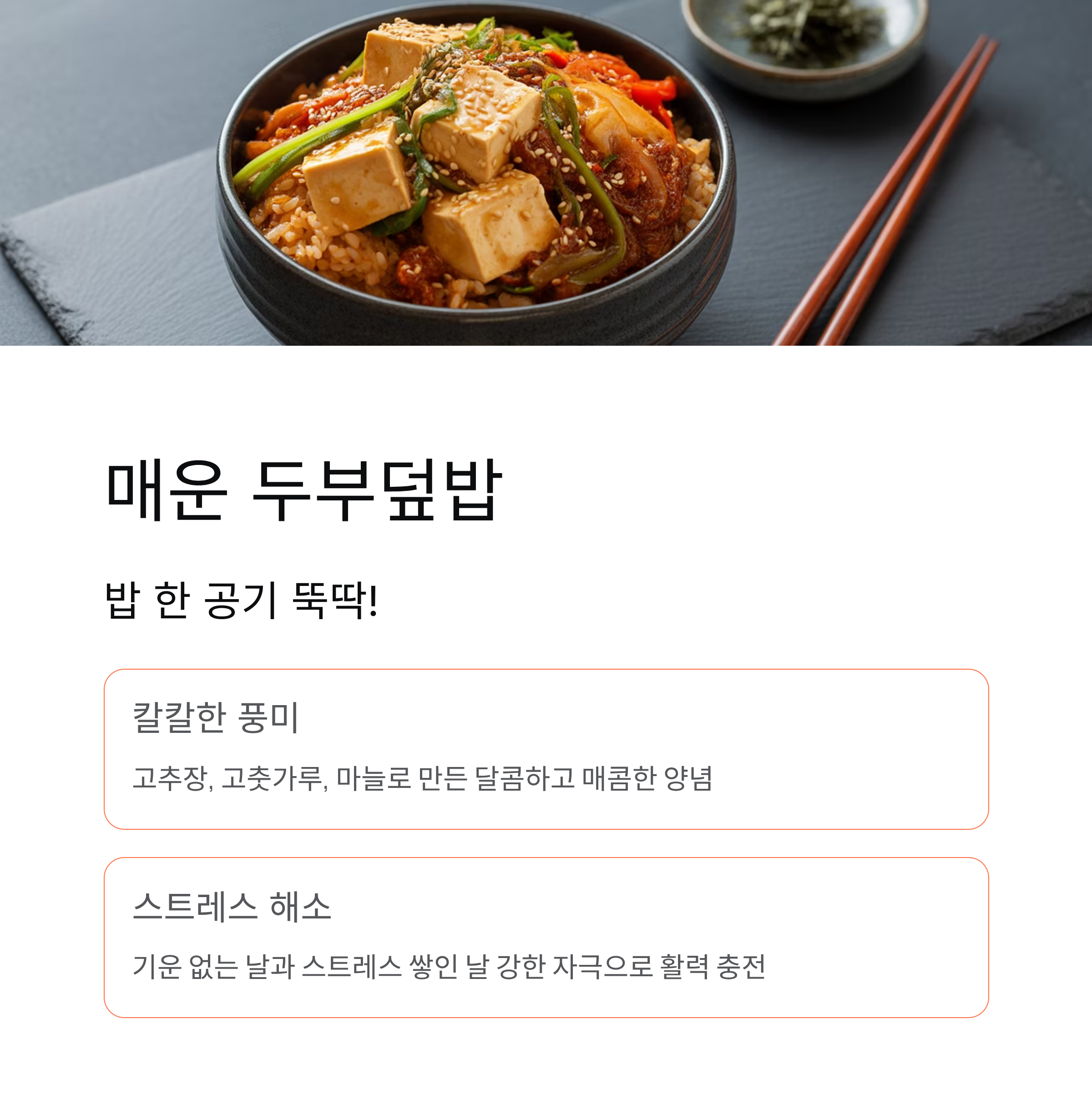 자극적인 맛으로 활력을 찾고 싶을 때는 매운 두부덮밥, 가족과 함께 편안하게 즐기고 싶을 때는 순한 두부덮밥을 선택해 보세요.