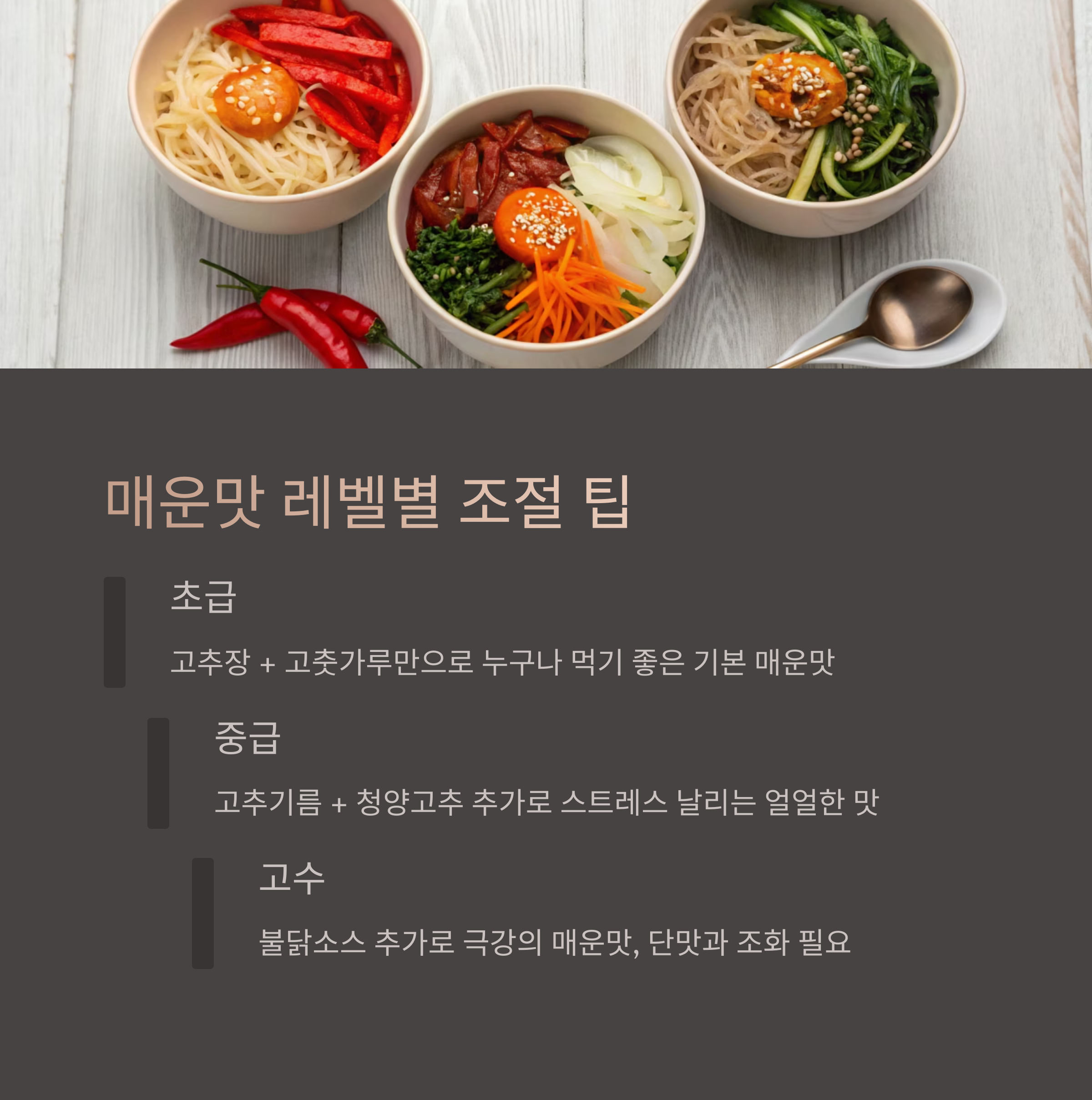 | 초급 | 고추장 + 고춧가루만 | 누구나 먹기 좋은 기본 매운맛 |
