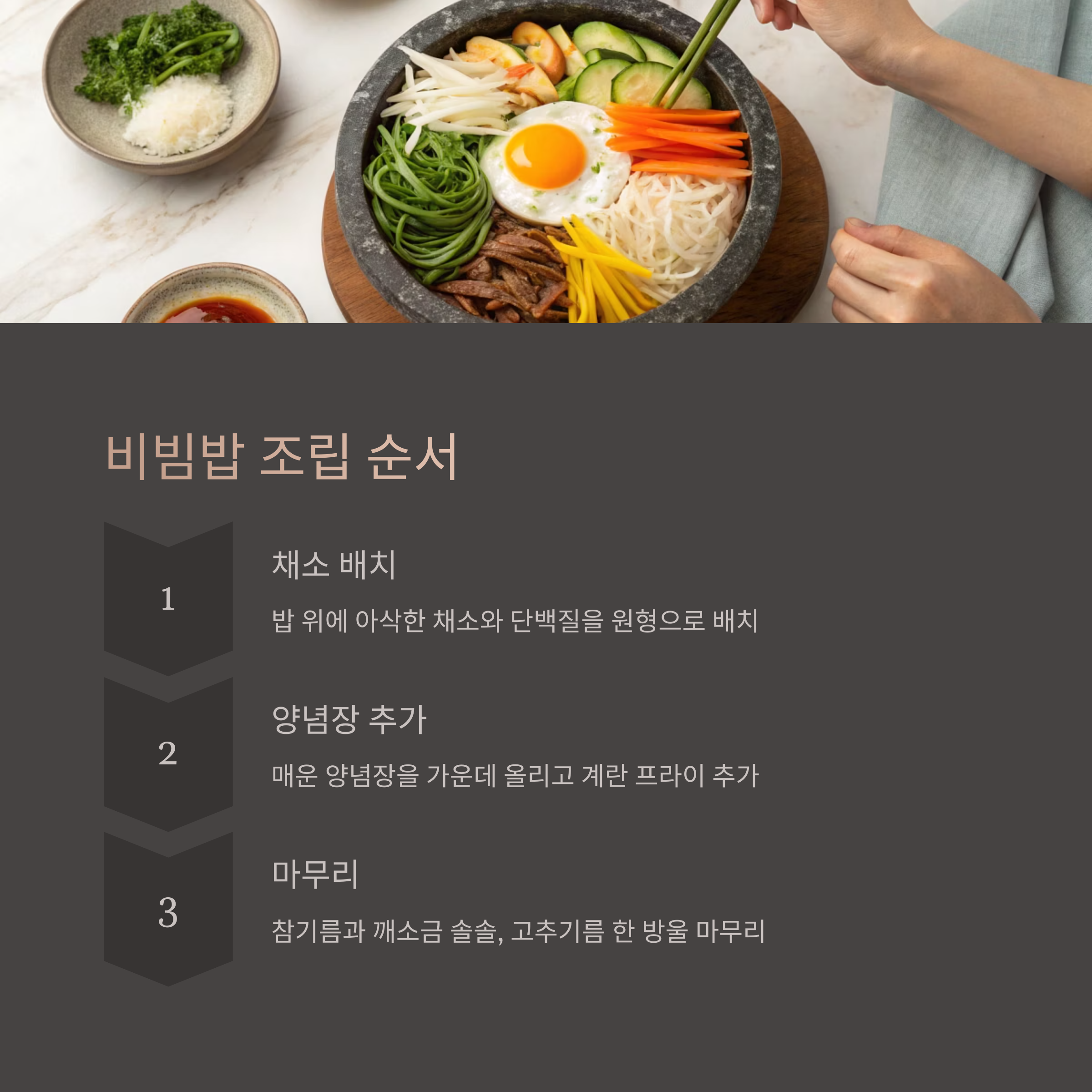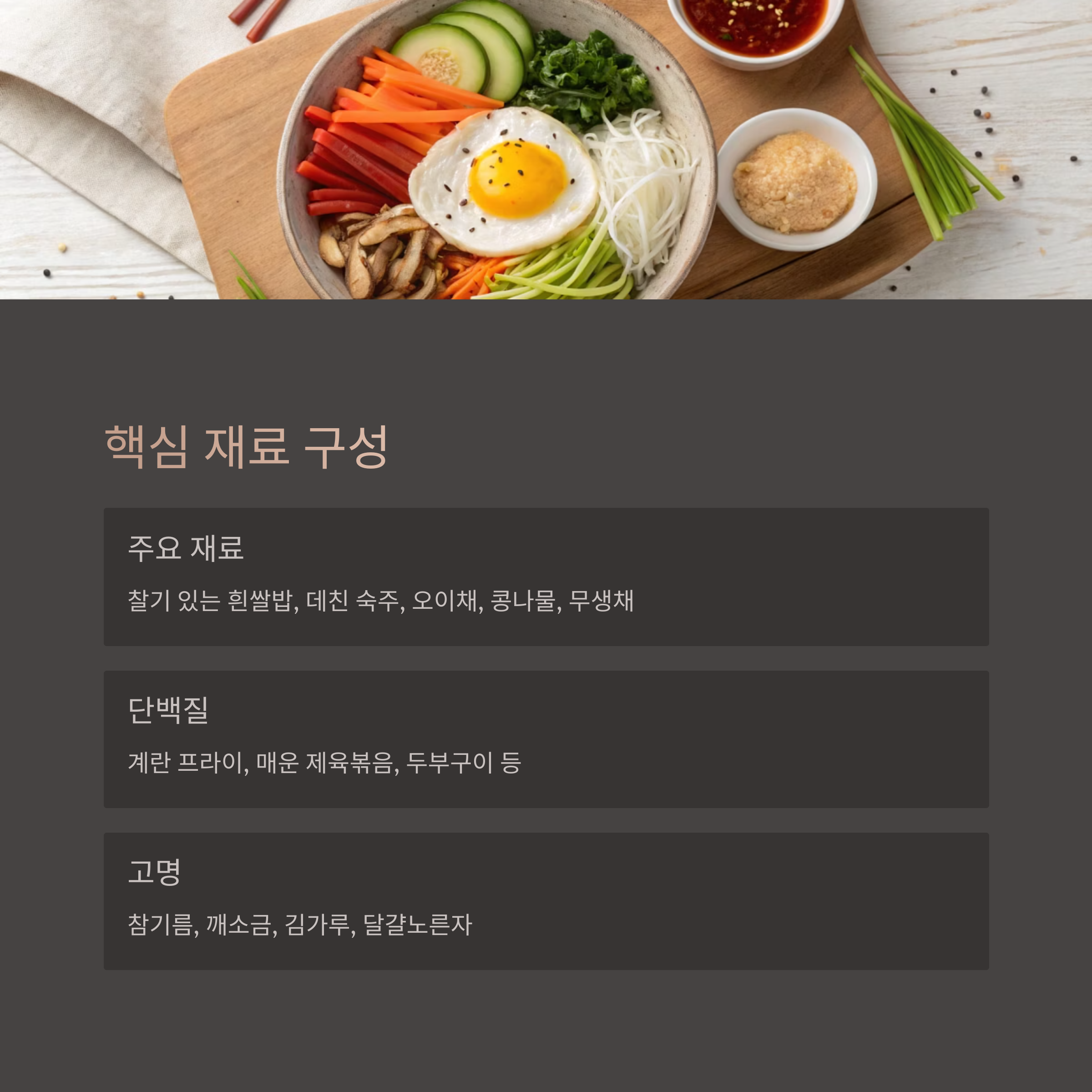 | 고명 | 참기름, 깨소금, 김가루, 달걀노른자 등 풍미 요소 |