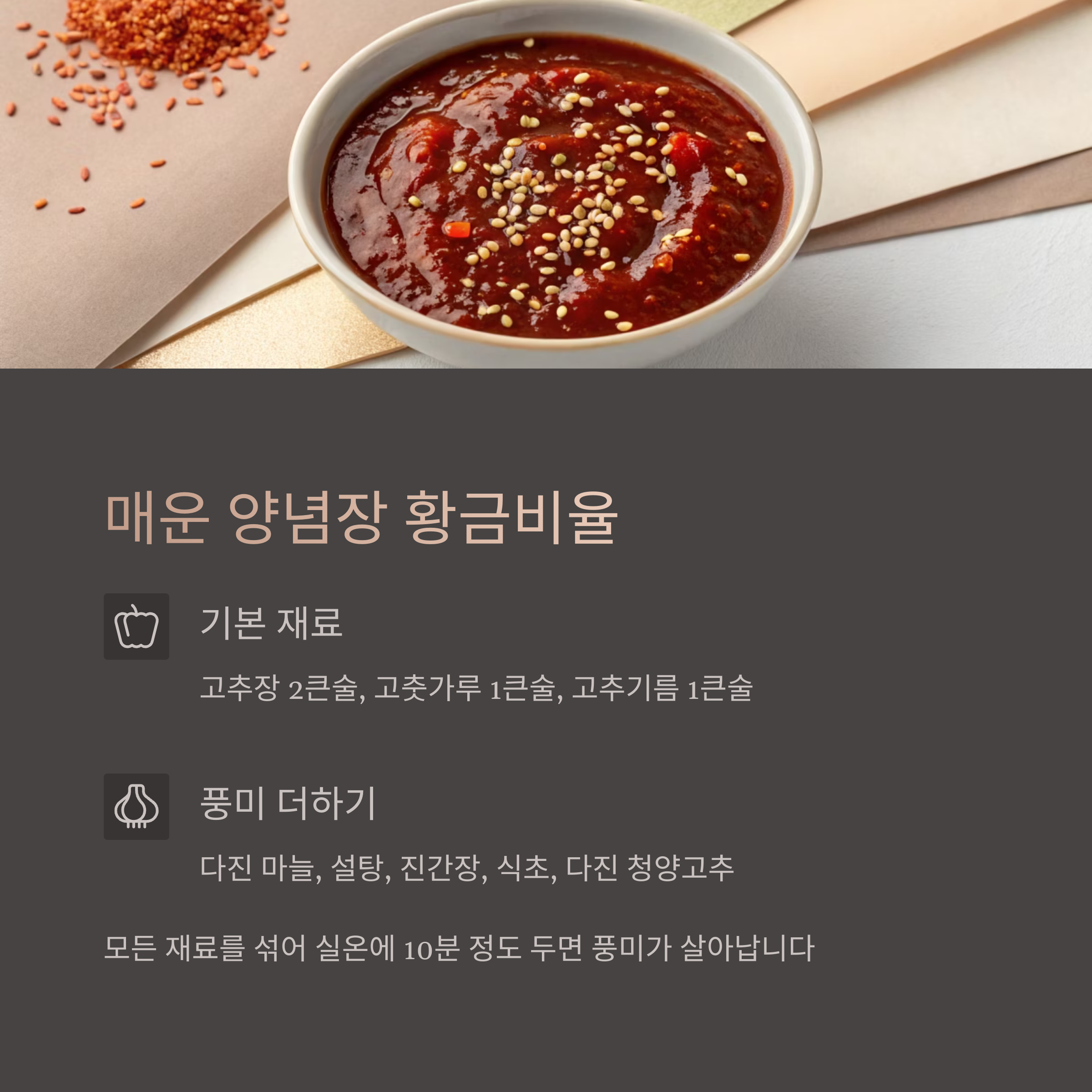 맛은 화끈하지만 조화롭고 깊은 풍미의 양념장으로