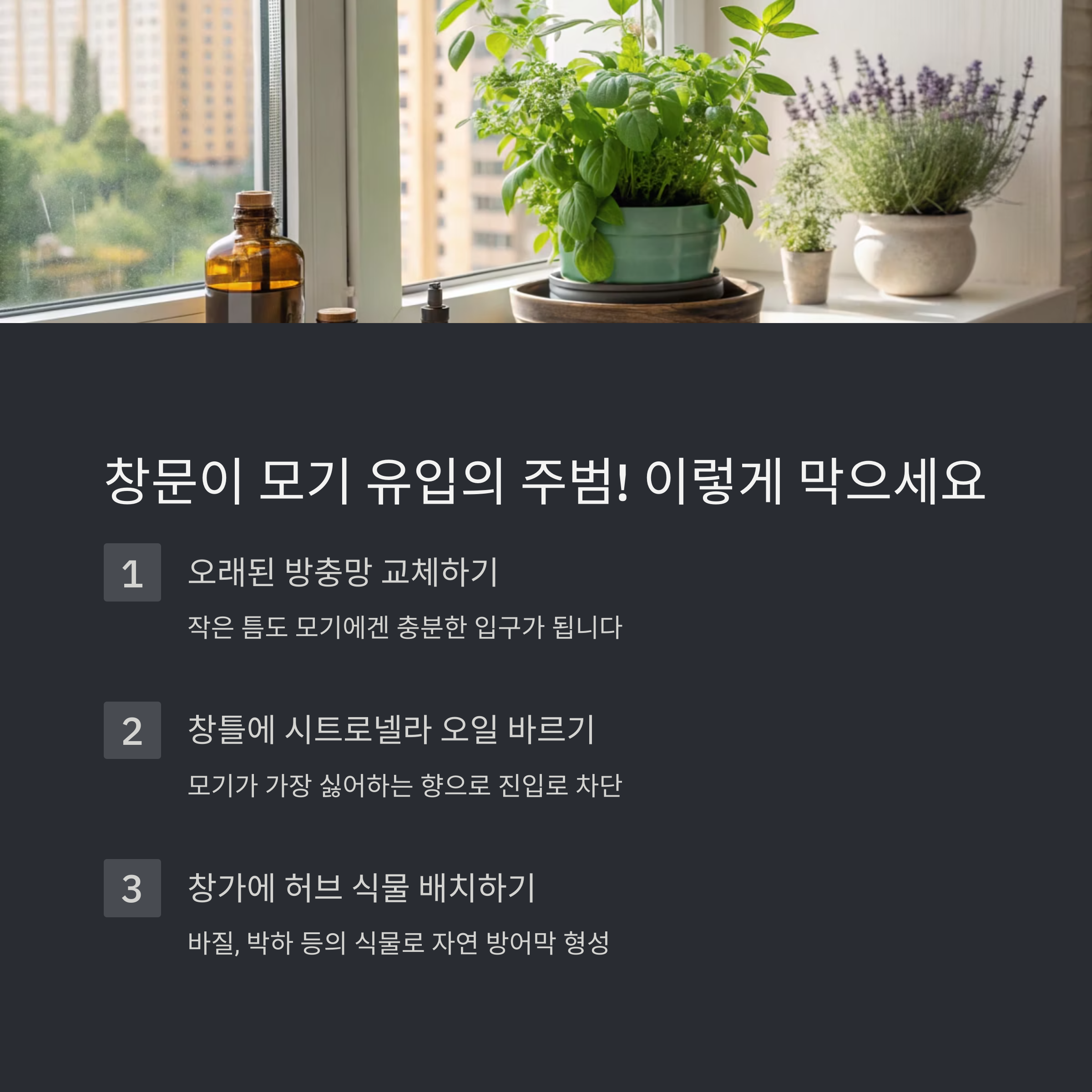 이 조합만으로도 창문 주변 모기 접근을 눈에 띄게 줄일 수 있습니다.