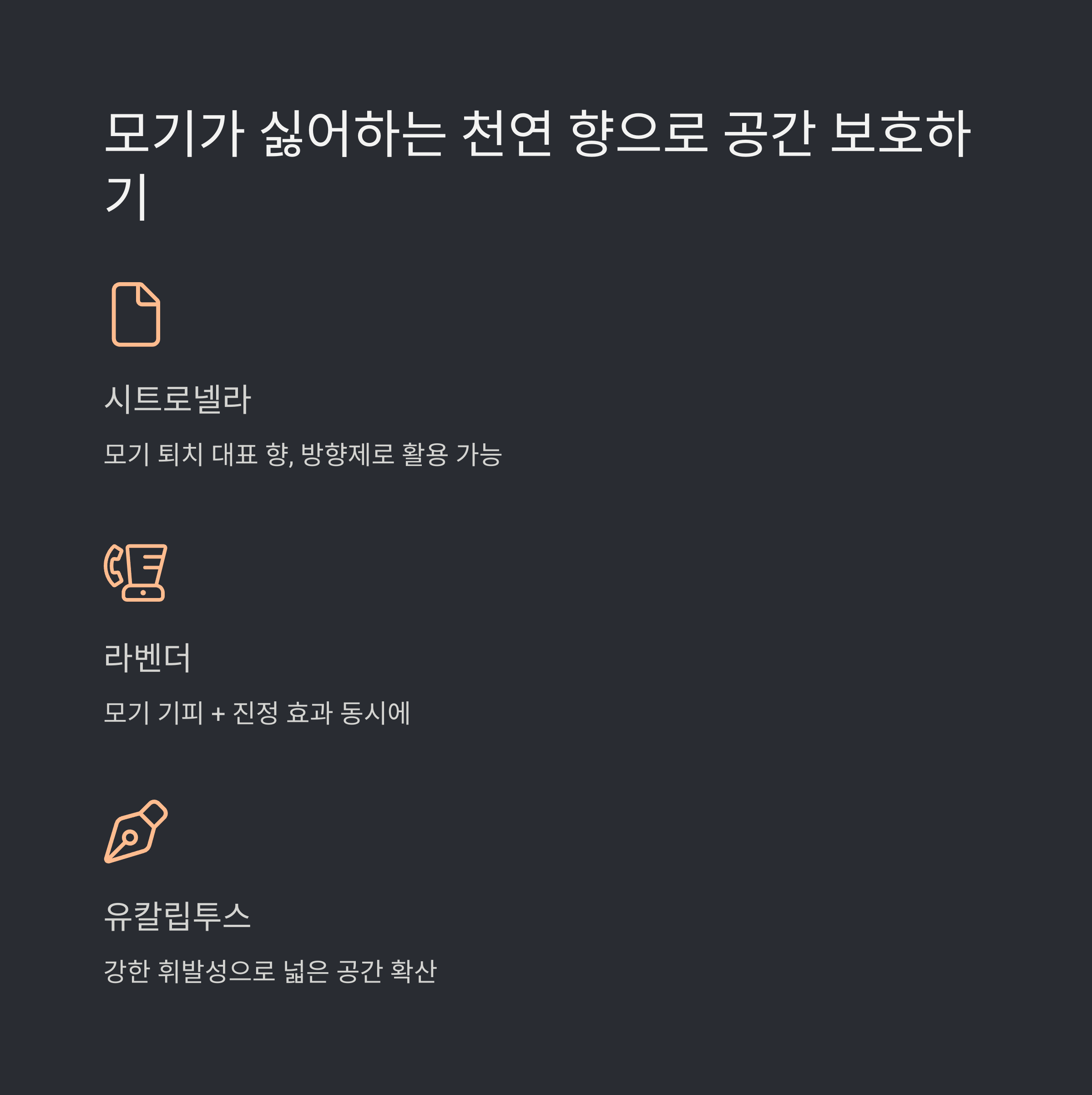 | 시트로넬라 | 모기 퇴치 대표 향, 방향제로 활용 가능 |