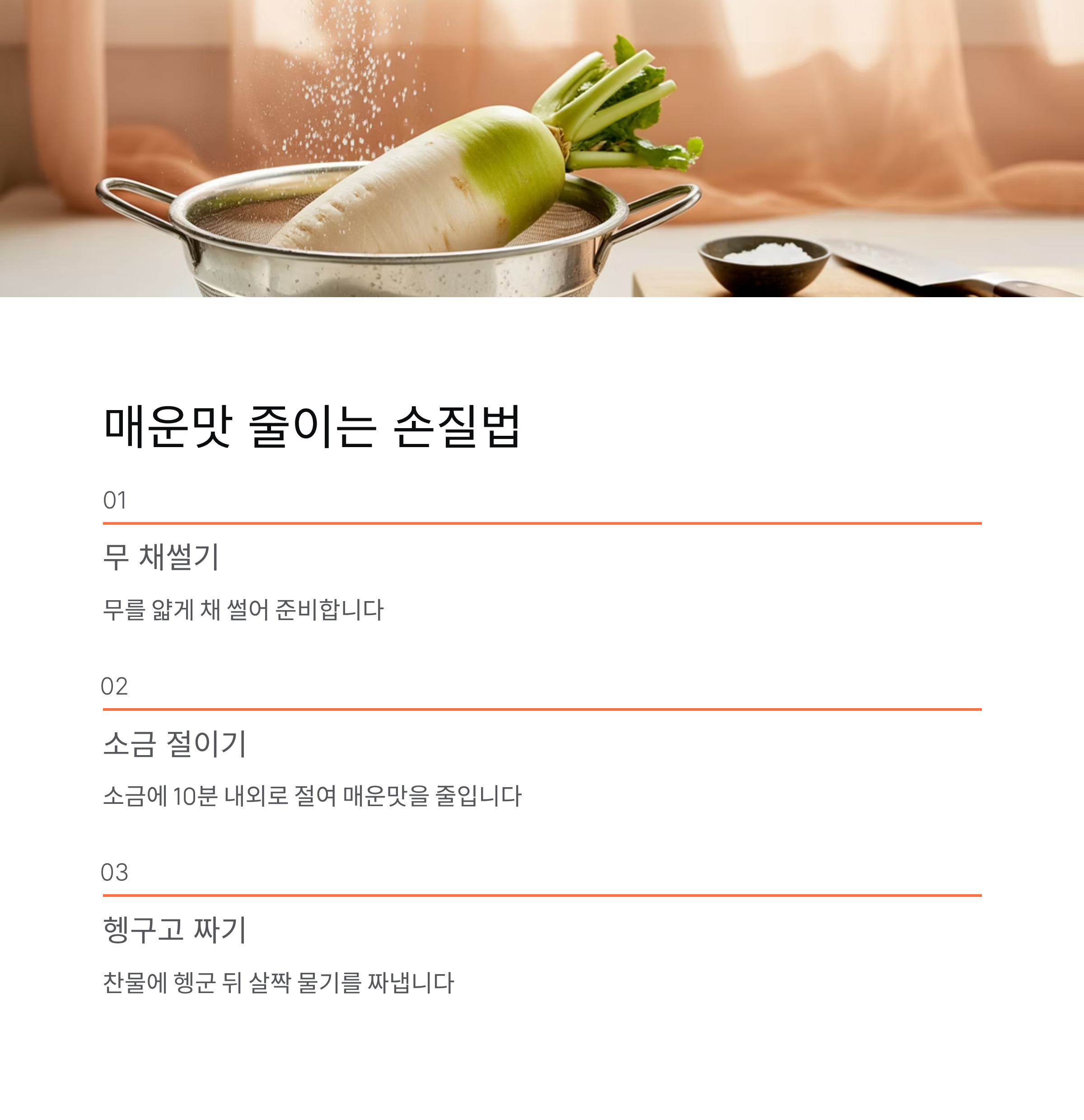 무를 채 썰어 소금에 잠깐 절여주면 매운맛이 줄고 수분이 빠져 한결 아삭해집니다. 이때 너무 오래 절이면 질겨지니 10분 안팎이 적당합니다. 헹군 뒤 살짝 물기를 짜서 양념에 버무리면 깔끔한 맛이 살아나요.