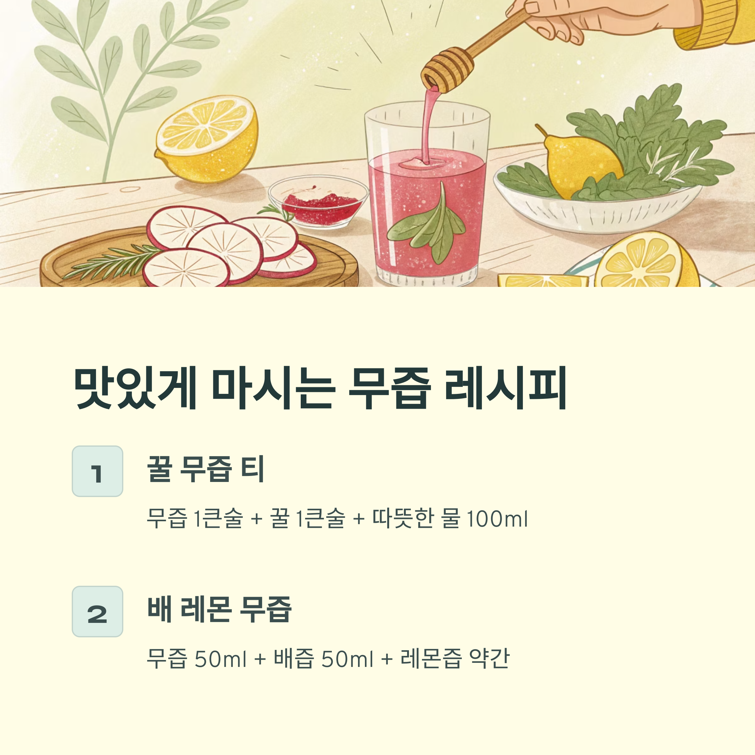 - 무즙 1큰술 + 꿀 1큰술 + 따뜻한 물 100ml