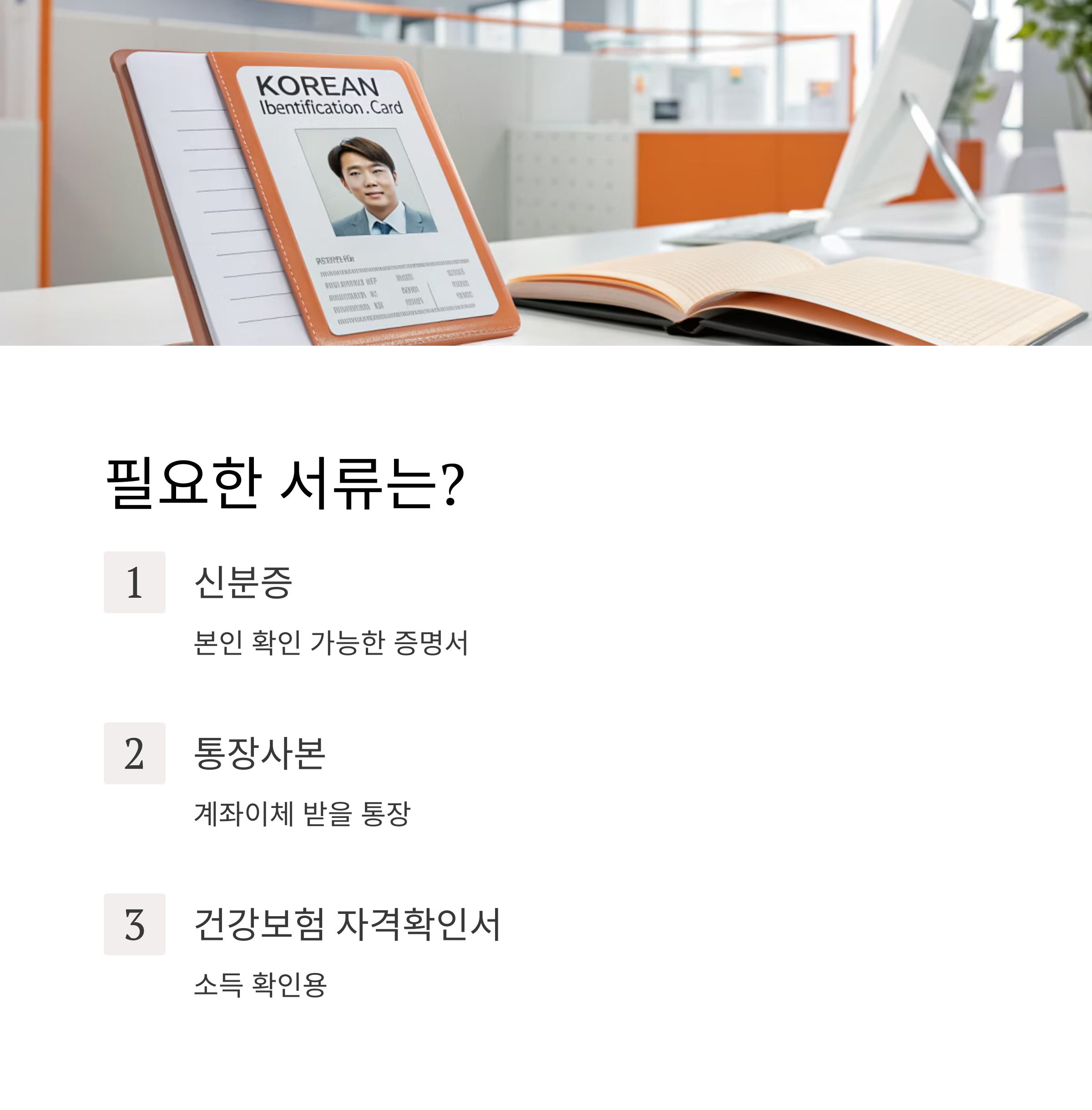 본인 확인 가능한 신분증과 통장사본, 건강보험 자격확인서가 필요합니다.
