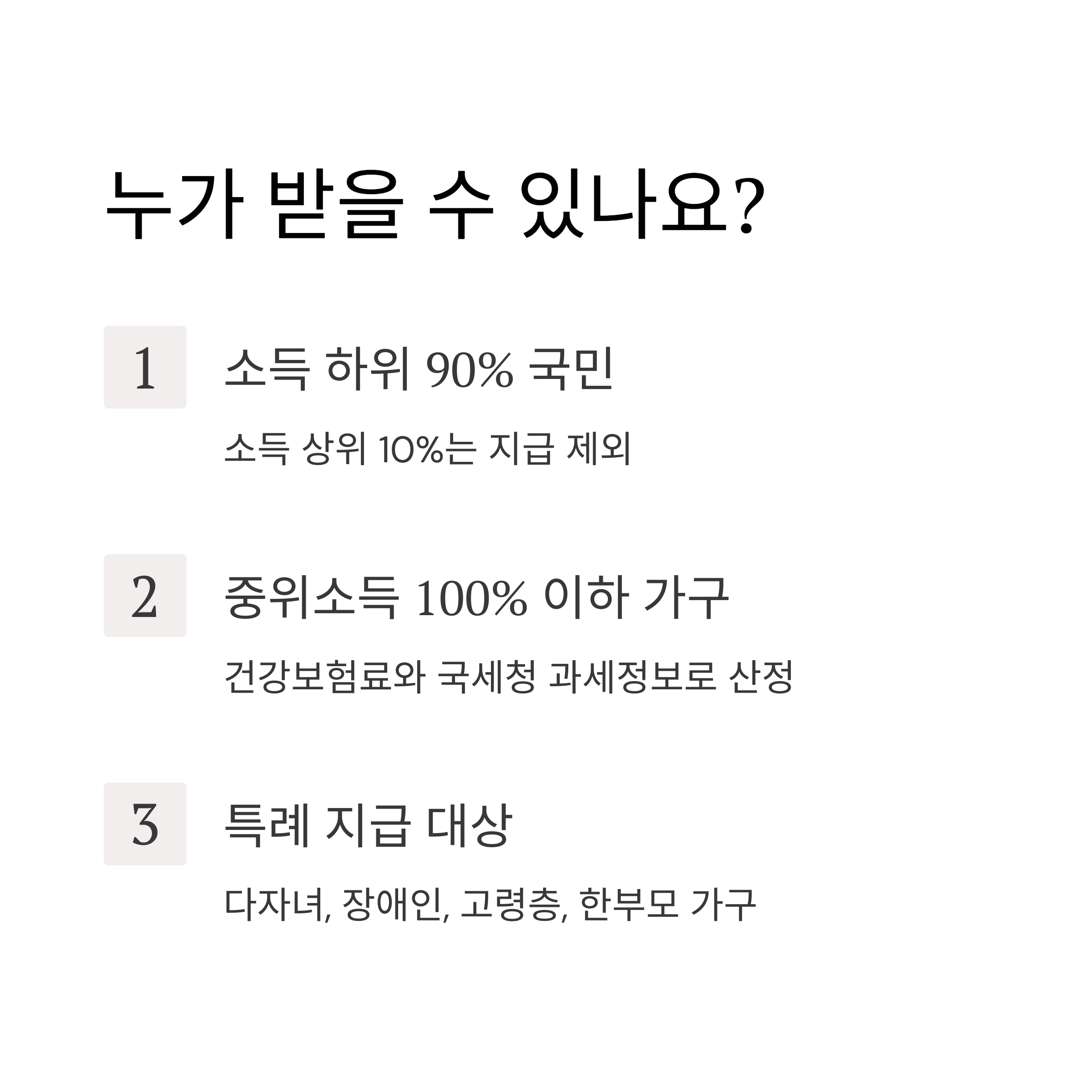 | 제외 대상자 | 중위소득 초과 + 상위 10% 추정 고소득 가구 |