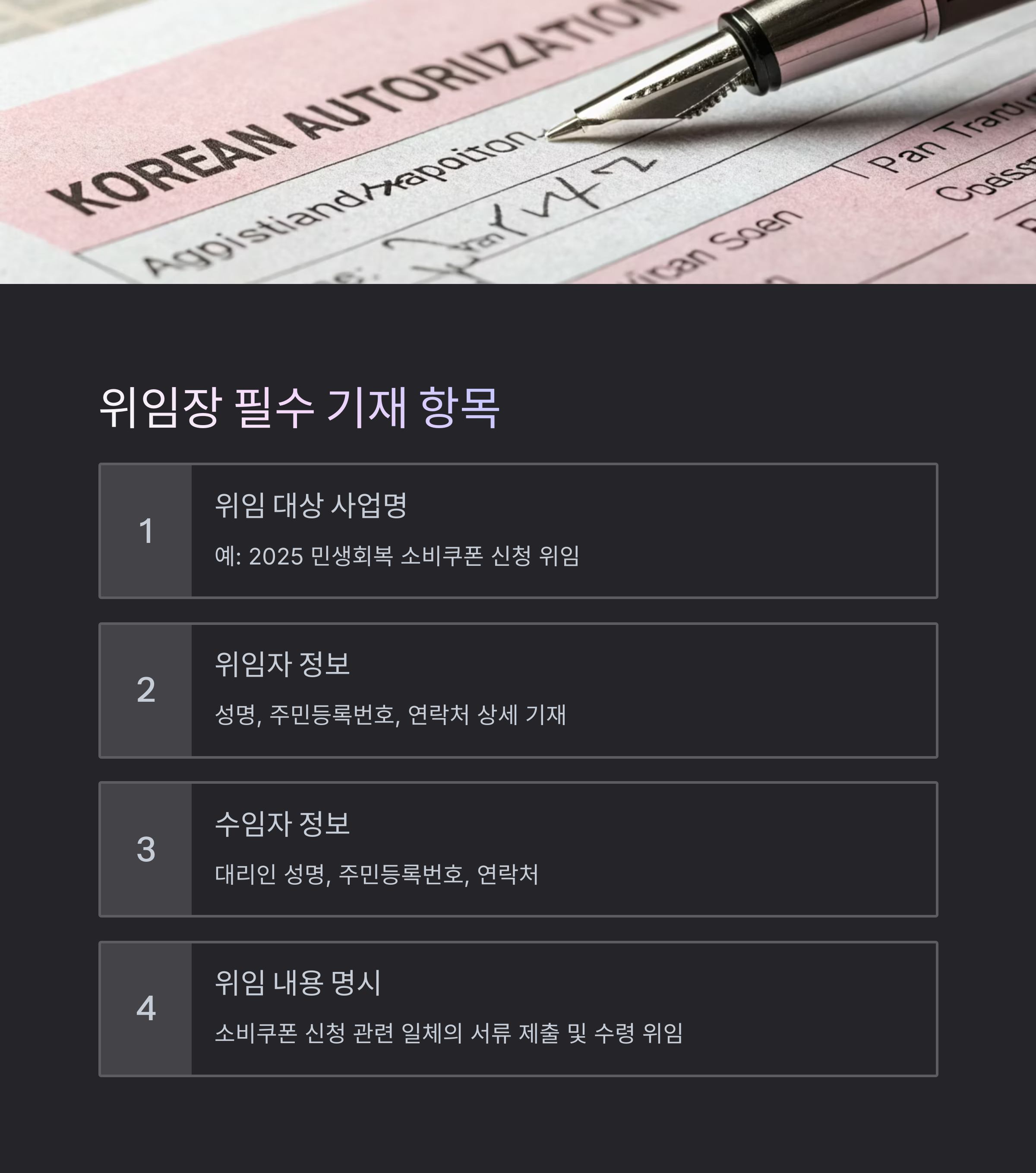| 위임 내용 명시 | ‘소비쿠폰 신청 관련 일체의 서류 제출 및 수령 위임’ 등 |