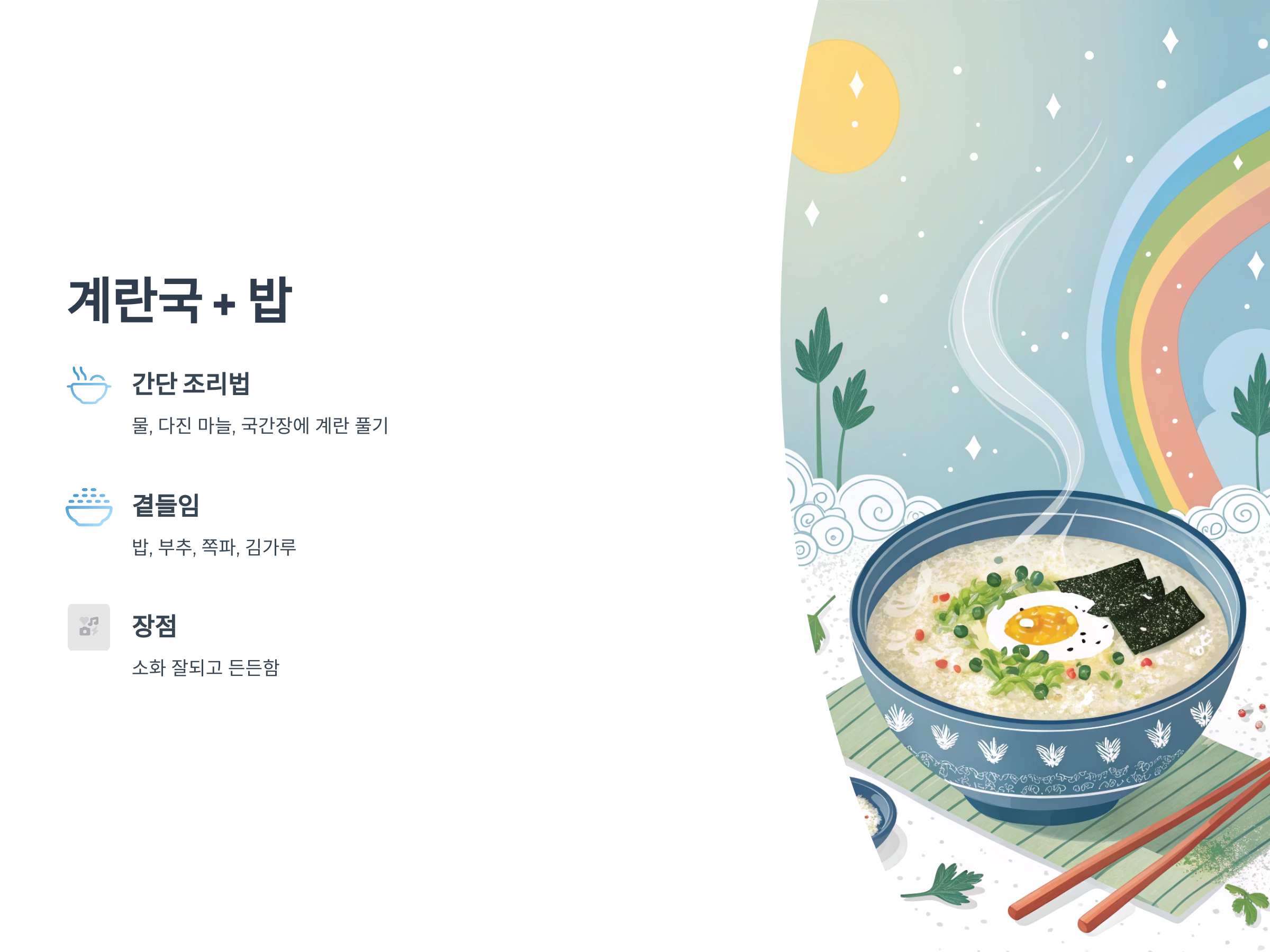 속이 부담스럽고 입맛이 없을 땐 계란국 한 그릇에 밥을 살짝 말아 먹는 방식도 훌륭합니다.