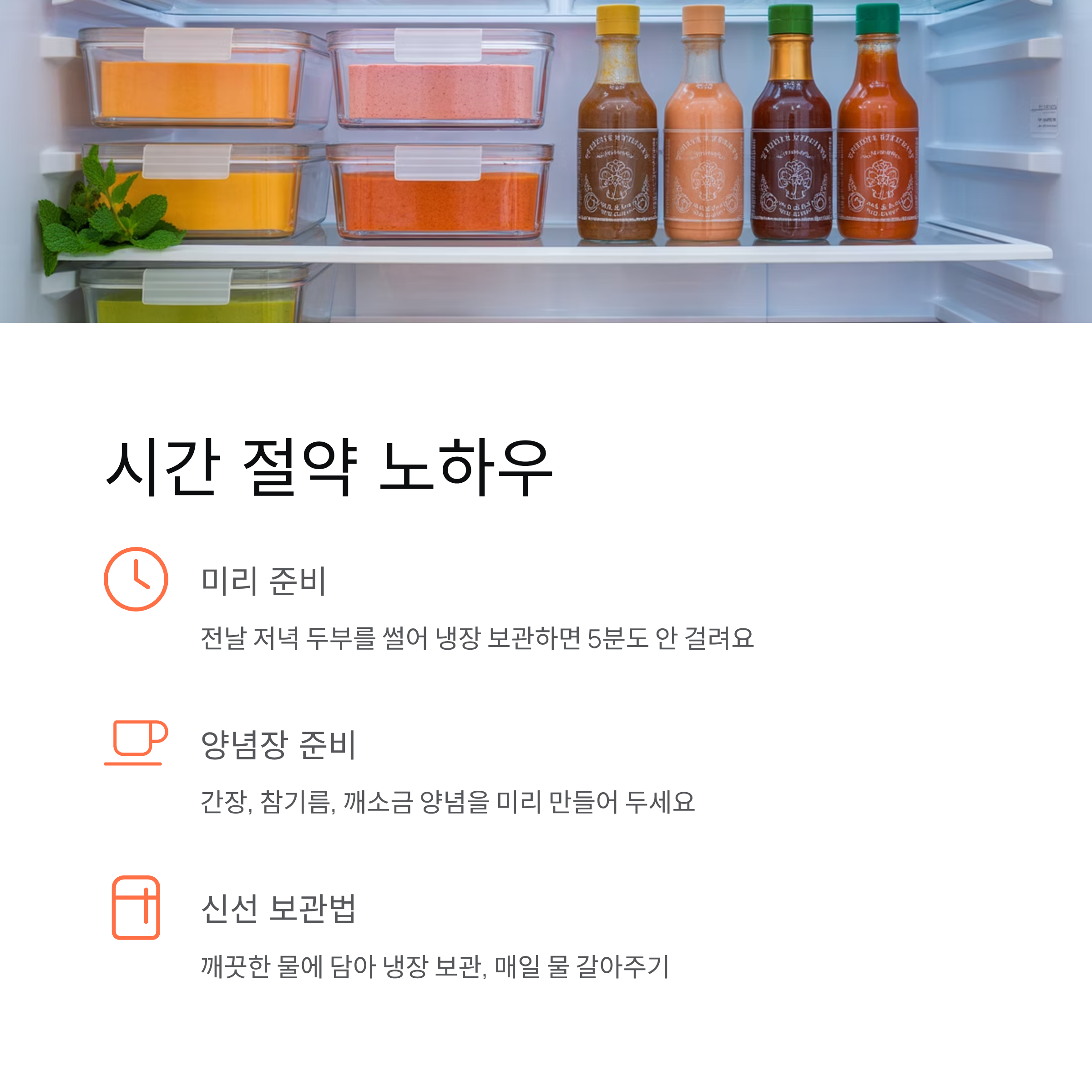 아침마다 시간을 줄이려면 전날 저녁에 두부를 미리 썰어 냉장고에 보관하세요.